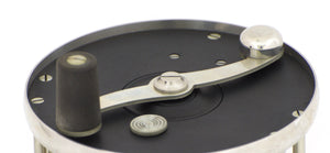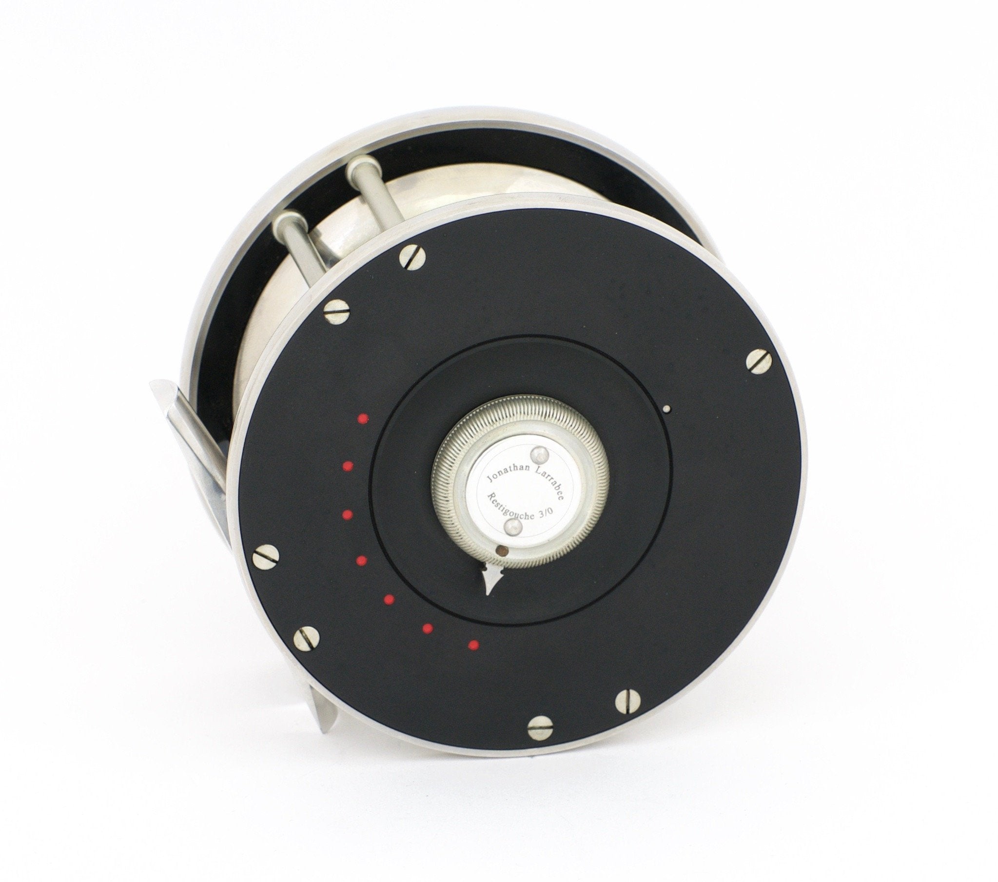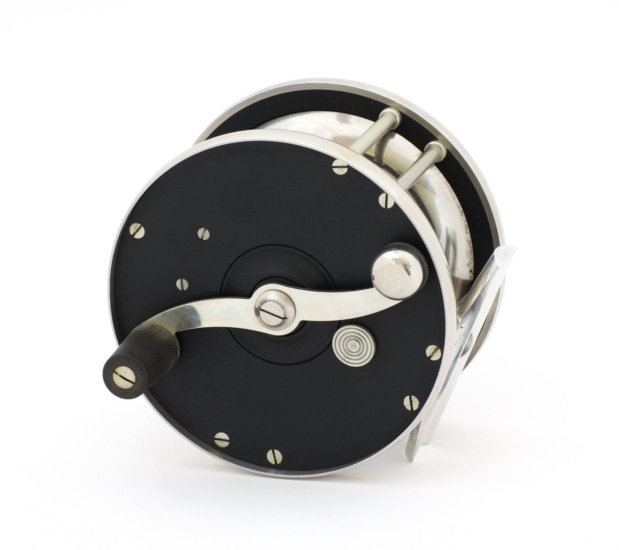 For sale here is a 3/0 salmon fly reel designed by Fred Balling of the Perfection Fly Reel and marketed through Bass Pro Shops. The production run ended up being approximately twenty reels. A fine effort and an extremely difficult reel to locate on the resale market. This particular reel comes from the estate of the master reel maker, Dr. Paul Hermann. It comes with a fine Arne Mason reel case. Mr. Jon Larrabee was also involved in limited design collaboration with Mr. Balling and ended up supplying one his stamped oil caps.