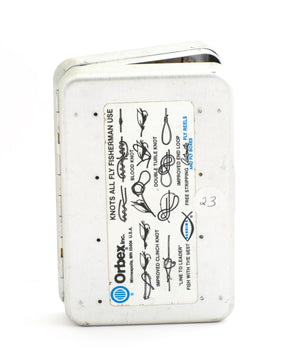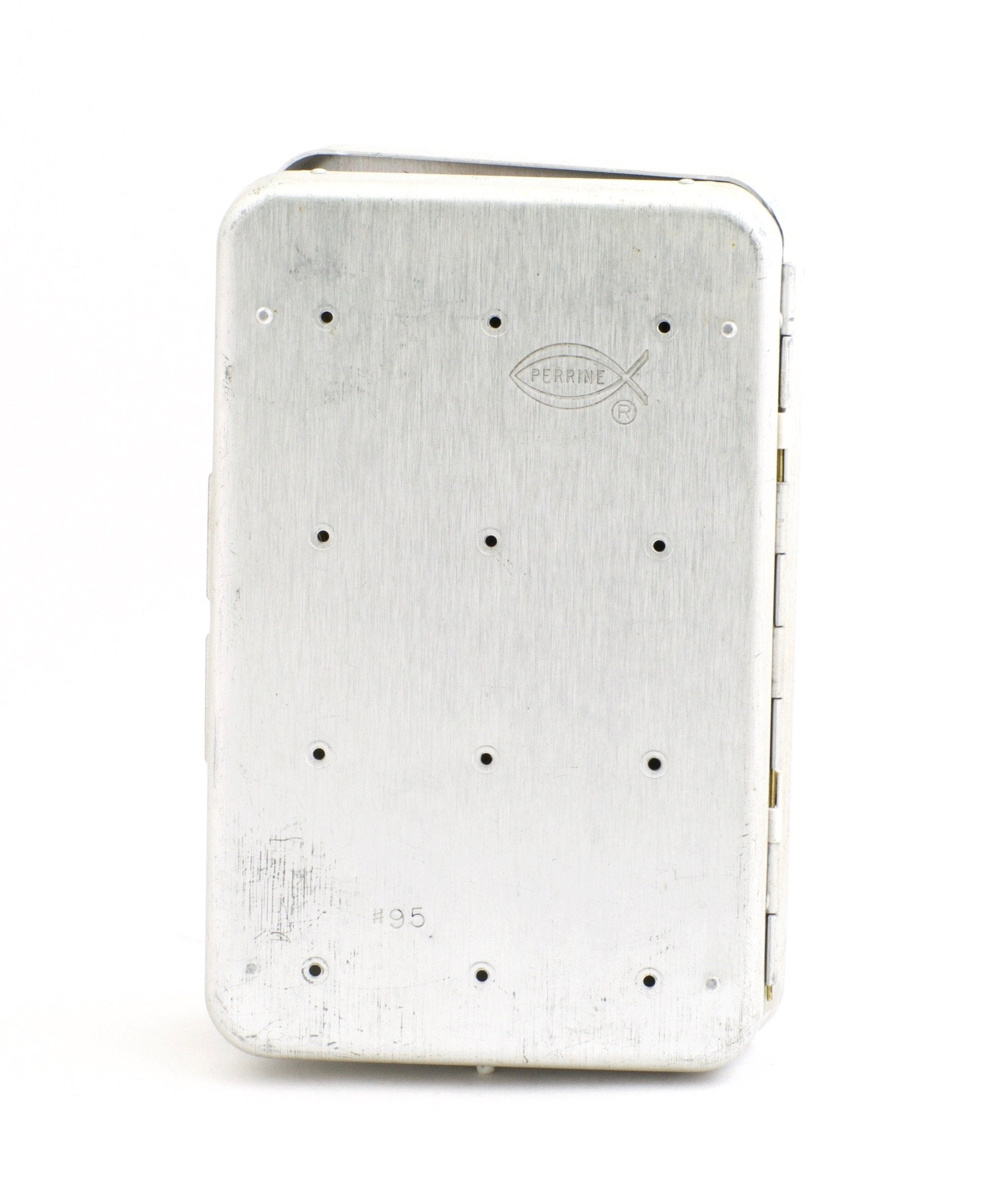 For sale here is a Perrine #95 fly box with many fine vintage salmon flies. The box is in excellent condition with only light wear. Dimensions are 6" long - 3 3/4" wide - 1 1/8" deep. The box closes squarely and securely though the double hook salmon flies currently in the box prevent this as they are too large. The box features 80 clips for flies. There is a plastic hinging leaf in the middle. All of the approximately 70 flies are in excellent condition and appear to be un-fished.