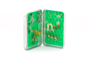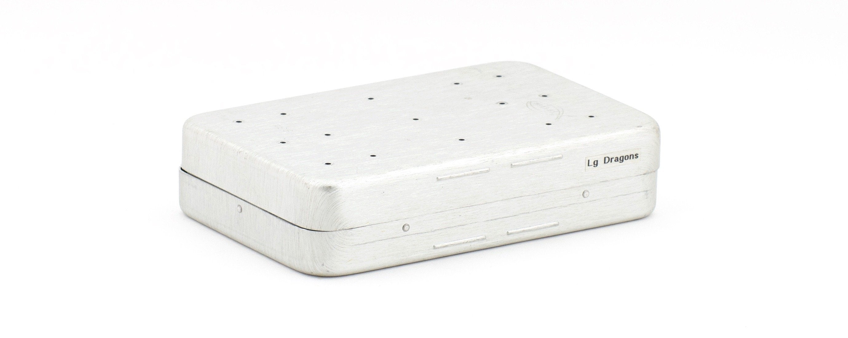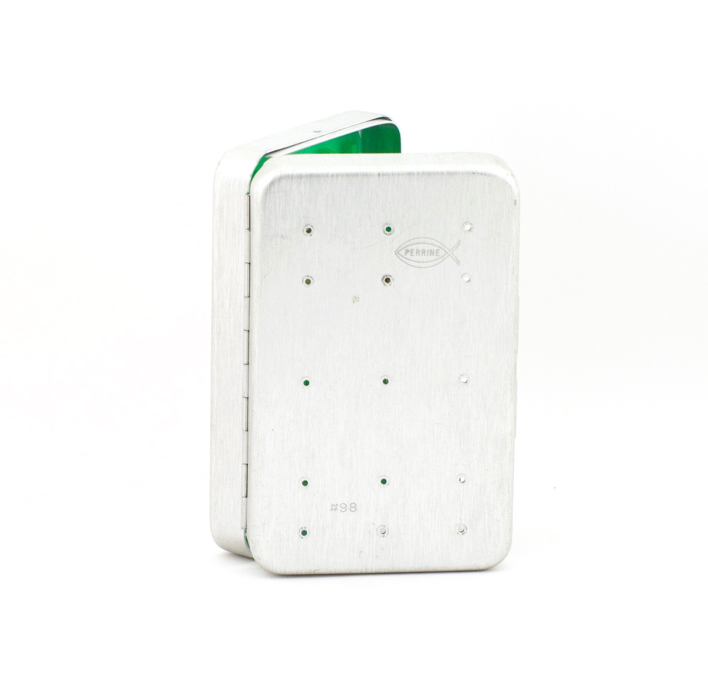 For sale here is a Perrine #98 fly box with vintage dry flies. External condition is excellent+. Internal condition is excellent+. Dimensions are 6" long - 3 3/4" wide - 1 1/2" deep. All of the 20+ dry flies (drakes, and assorted Catskill style dries) are in excellent condition. Most are larger sizes (8-12) with a few medium sized (14-16). The 100 plastic clips are in excellent condition void of any flaws. A classic box for larger dry flies.