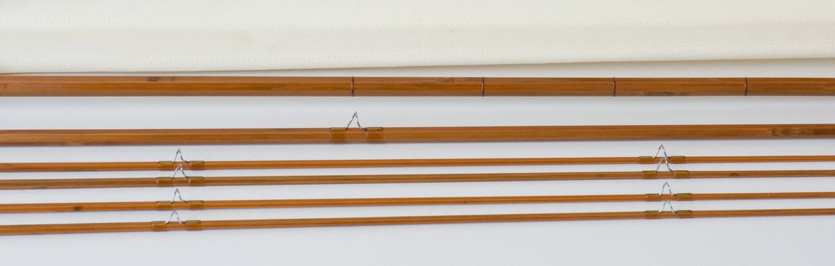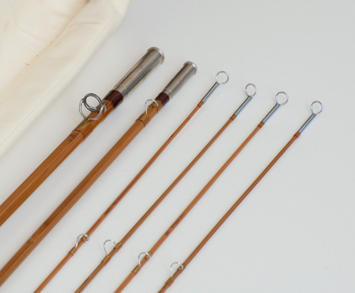 The rod has been fished sparingly and remains in excellent plus condition. Three of the tips have slight fishing sets but these can be remedied easily. Medium fast action. The rod only weighs 3 1/8 ounces. Original five-compartment bag and original labeled tube.