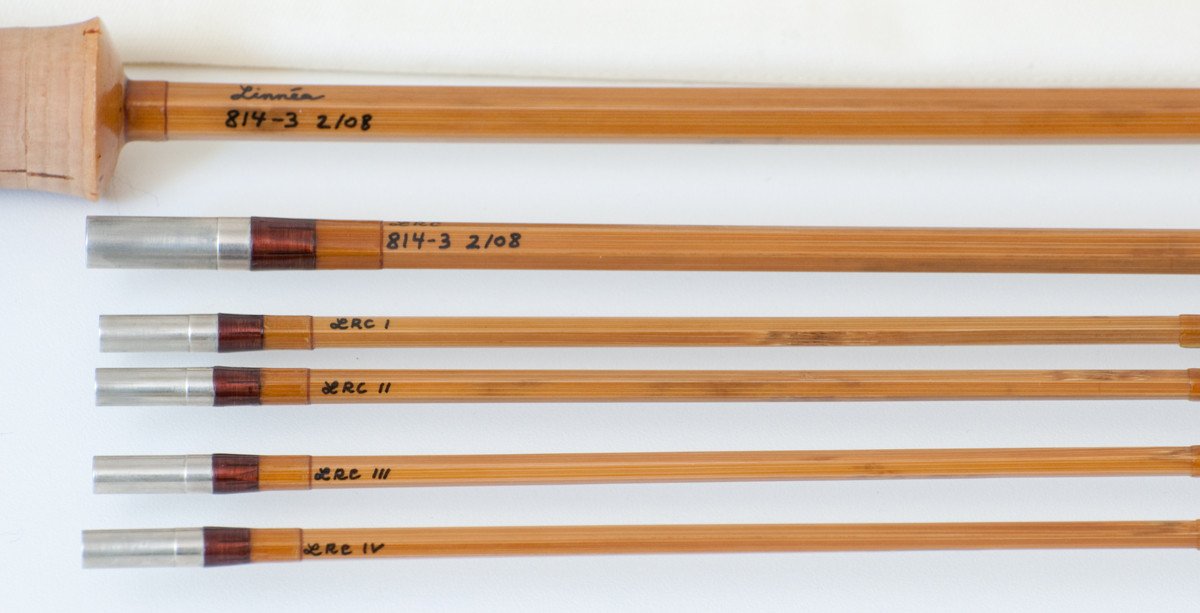For sale here is a Linnea Model 814-3 hollow-built bamboo rod by Erik Peterson. 8'1" for a 4 weight line. The rod has three sections and four tips! Here's Erik's description of this model: "There are many views on three piece rod design in terms of the effect that ferrules have on rod action. From my perspective, when properly designed, the placement of ferrules on a three piece rod has a tendency to smooth out the casting characteristics, make the action feel crisp and eliminate the “pulling” effect that a second ferrule can otherwise have. The 814-3 achieves a continuity of action by the manipulation of the dimensions both in the rod taper and hollow cutting in the portions of the rod that transition from bamboo to the ferrule. The resulting rod is crisp and fluid. The 814-3 is designed for fishing sized medium spring creek waters."