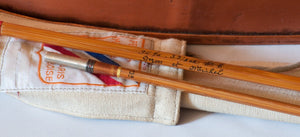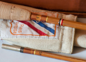 For sale here is a Pezon et Michel Parabolic Royale bamboo rod. 7'4 2/1 for a 5 weight line. Made in France. Staggered ferrule set up with original plug. Comes with original P&M rod bag and no tube. In very good original condition. This rod is a super stout, parabolic medium fast action rod. Note, this is a French made P&M, not a Sharpe's or Farlow's rod built on a P&M blank. There are a few marks and chips in the varnish, with the most affected area being above the male ferrule on the tip section. Rod is sound as is, but could eventually use an over-varnish. Otherwise, the rod is in excellent condition and a great fishing rod. The rod weighs 3 3/8 oz.