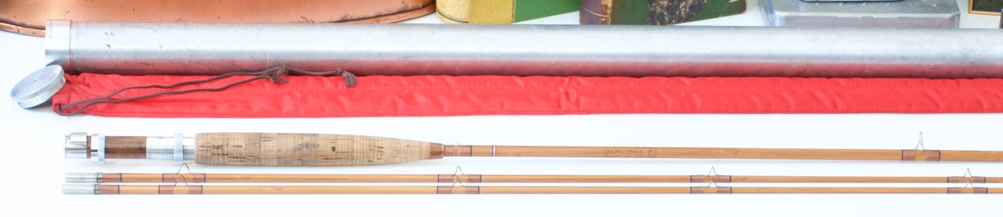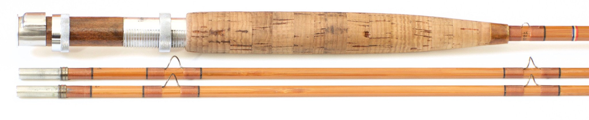 For sale here is a Pezon et Michel "Parabolic Royale Super" bamboo rod - 8'3" 2/2 for a 5 weight line. Excellent original condition. The one issue being the wrap below tip-top #2 has began to come unraveled and will need attention at some point. The rod is part of the PPP line of P&M rods. Made in France. Staggered ferrule construction, the butt section being 6 inches shorter than the tips. Includes 6 3/4" bamboo ferrule plug P&M is so well known for. Lightly tempered cane with bronze wraps and black tipping. Blue, white, and red signature wrap; a tribute to France. U-shaped hook keeper. Bronzed guides with the exception of the bright stripping guide and tip-tops. Burlwood winding check. Cigar grip. The grip is soiled but in otherwise excellent condition. Aluminum down-locking reel seat with fine wood spacer. Oxidized ferrules size 16/64 with red witness marks, a hallmark of Pezon ferrules. The male ferrules are tapered to account for wear over time. The fit perfect. The action is on the faster side of medium-fast, parabolic, and authoritative yet smooth. A terrific rod for big flies and wind or when distance is a factor. Rod weighs 4 3/4 oz. Comes with original red satin rod bag and possibly the original tube. It seems that Pezon et Michel rod are greatly underrated in the US compared with their popularity overseas. Don't miss out on this fine fishing rod.