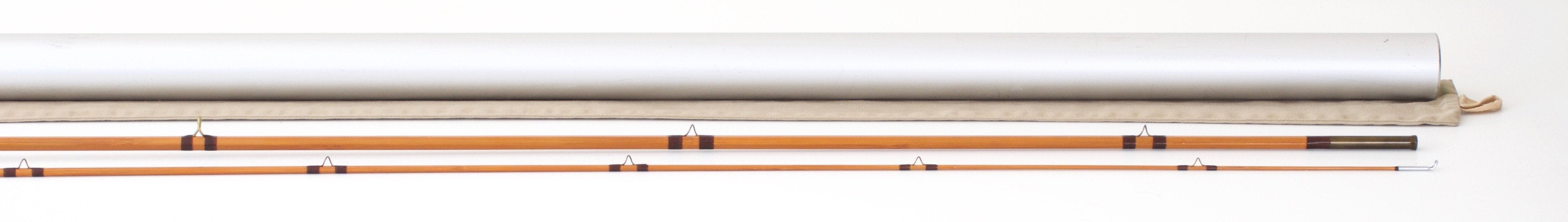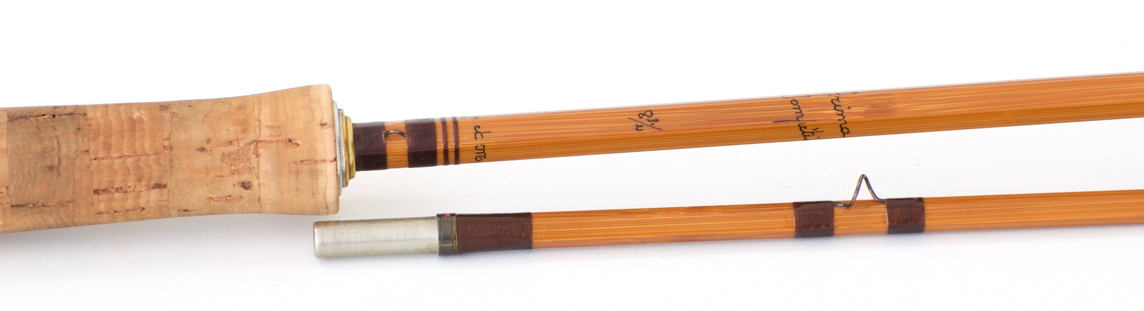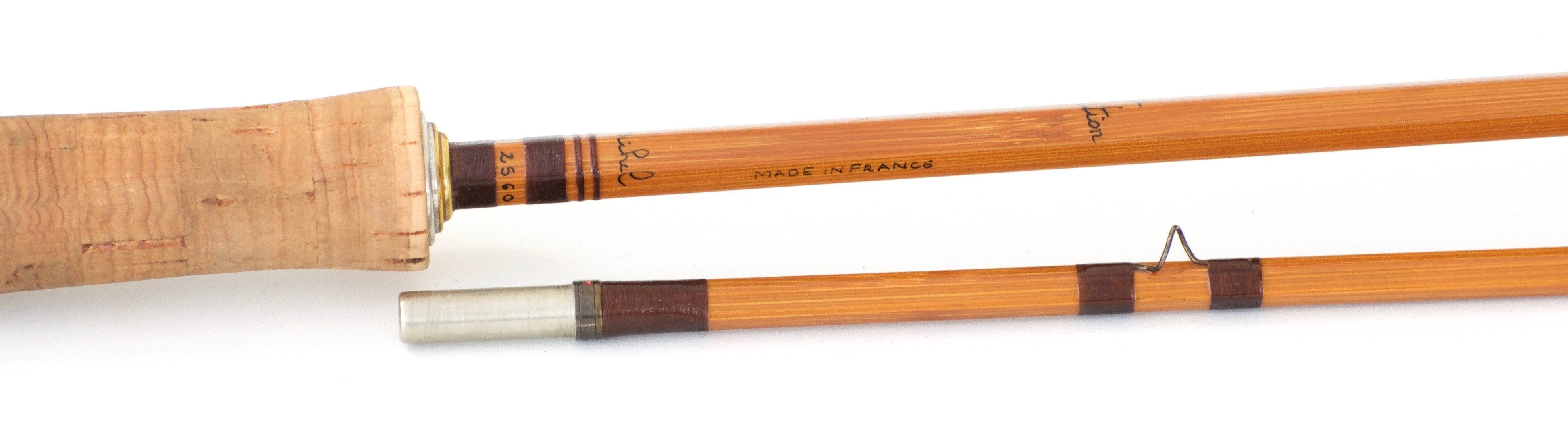For sale here is a Pezon et Michel "Prima Competition" 8'6" 5-6wt. Original format of two sections with one tip. Excellent+ original condition. Chestnut brown wraps. The script remains clean and bold. U-shaped hook keeper. Stepped aluminum winding check. Full-wells grip with moderate soiling. Aluminum down-locking reel seat. The seat and butt cap are free of any dents or major scratches. The size 17/64 ferrules are typical P&M with a red witness mark. The fit is perfect. The rod weighs 6 oz. The action is on the faster side of medium-fast. An excellent rod for big rivers or lakes where long accurate casts are needed. Includes original bag with P&M label and replacement aluminum tube.