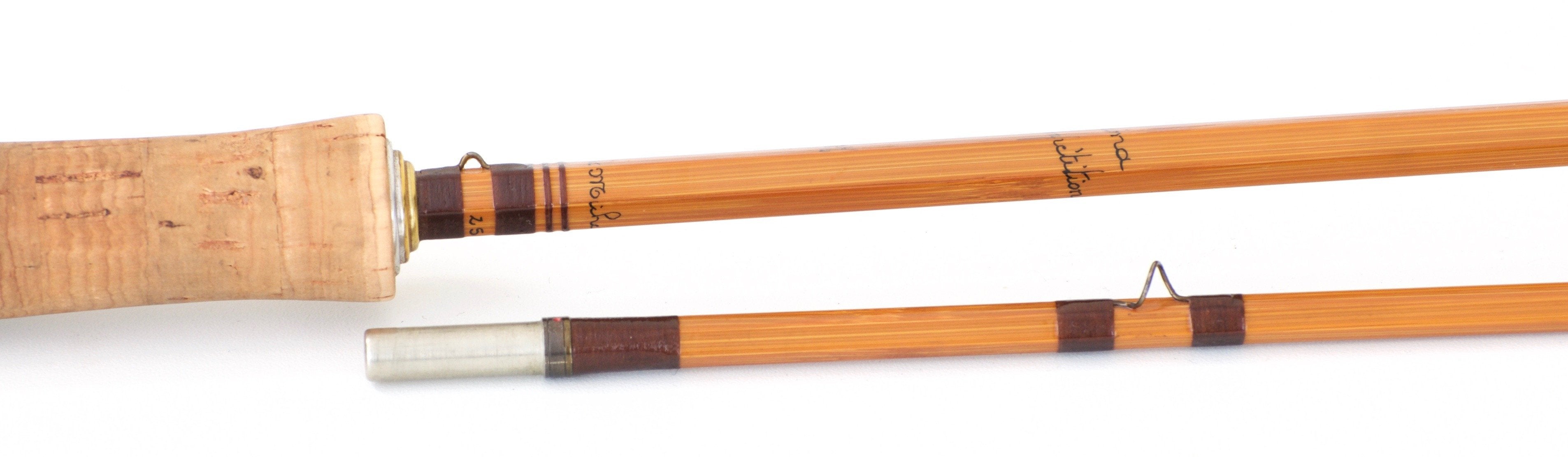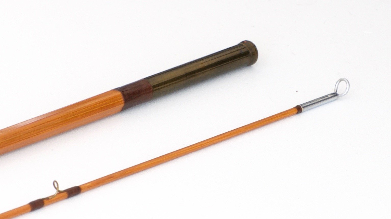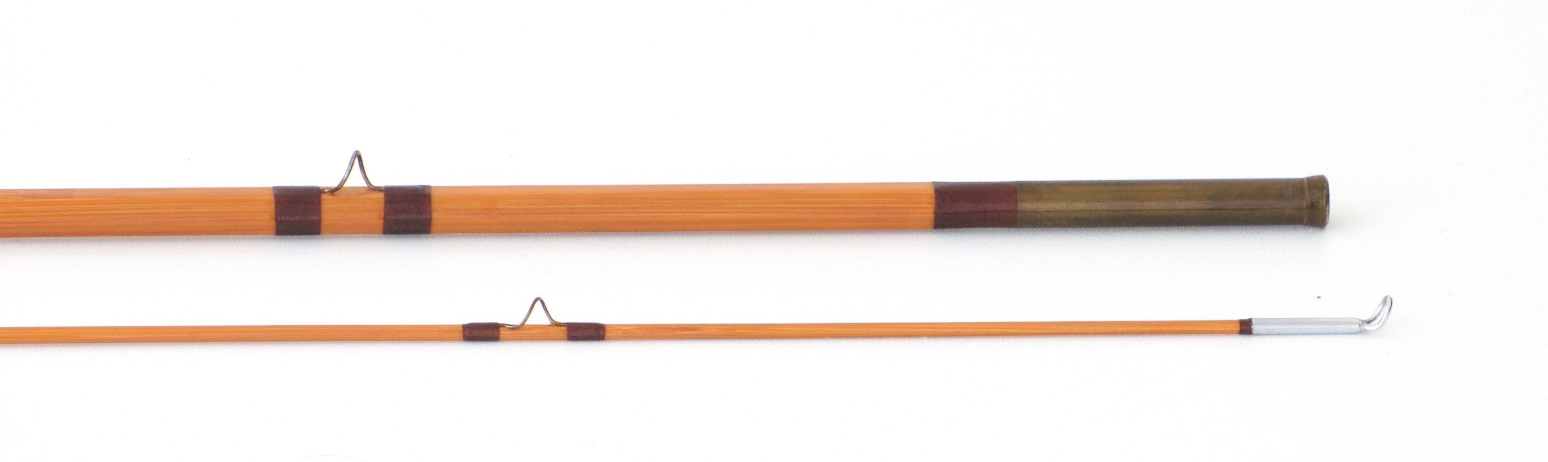 For sale here is a Pezon et Michel "Prima Competition" 8'6" 5-6wt. Original format of two sections with one tip. Excellent+ original condition. Chestnut brown wraps. The script remains clean and bold. U-shaped hook keeper. Stepped aluminum winding check. Full-wells grip with moderate soiling. Aluminum down-locking reel seat. The seat and butt cap are free of any dents or major scratches. The size 17/64 ferrules are typical P&M with a red witness mark. The fit is perfect. The rod weighs 6 oz. The action is on the faster side of medium-fast. An excellent rod for big rivers or lakes where long accurate casts are needed. Includes original bag with P&M label and replacement aluminum tube.