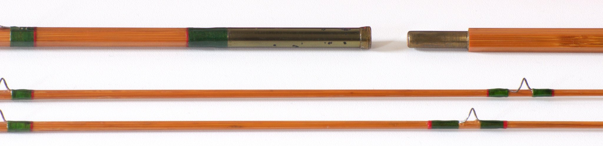 For sale here is a Pezon et Michel Super Parabolic PPP, Fario Club bamboo rod. 2.57 metres (8'5") for a 5 or 6 line. On the fast side of medium fast parabolic action. Made in France. Staggered ferrule set up with original plug; green tyings tipped with red; in original P&M red satin bag and screw top tube; uplocking reel seat. In very good condition overall. The varnish shows use and a few of the wraps and perhaps the entire rod may have received an overcoat of varnish at some time. The short tip (by 5/8") shows evidence of having been scarfed and is integrally sound. All sections are straight. Comes with original bag and green plastic tube. Note, this is a French made P&M, not a Sharpe's or Farlow's rod built on a P&M blank. The rod weighs 5 1/2 oz.