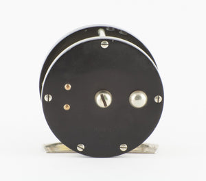 For sale here is a 60 yd Pflueger Golden West fly reel in excellent+ condition. The creme de la creme of the Pflueger reel lineup was and remains the Bulldog-trademarked "Golden West". What makes this reel very unique is the aluminum sandwiched between two layers of hard rubber to form the rims. Similar to the Hawkeye, the Golden Wests have nickel silver parts and a hard rubber handle as well. Most of the Golden West reels had a serial number stamped into the hard rubber on the backplate. This one reads "6812". Mechanically, this reel is in excellent++ condition, very tight and a very strong consistent click. On/off button works as intended.