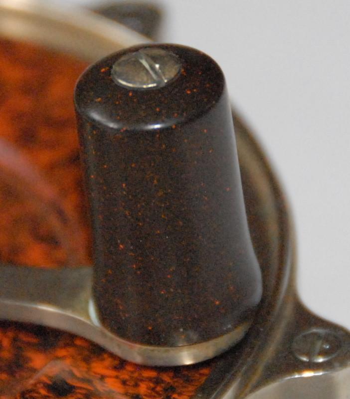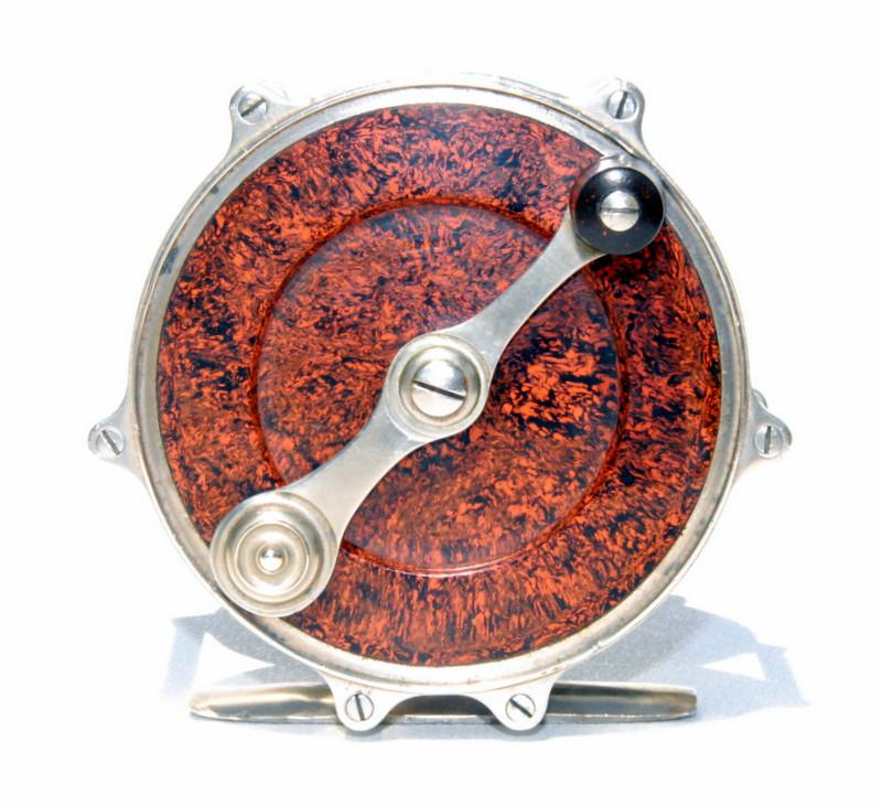 The reel remains in original and excellent working condition. The nickel silver grasp is straight as can be and doesn't rub anywhere while winding. There are no dings to the nickel silver rims. The reel foot is original, full-length, straight with no kinks/bends and it is unblemished. All of the nickel silver screws are original and in excellent condition. The marbleized hard rubber is entirely free from cracks and the stamp is very clear to this day.