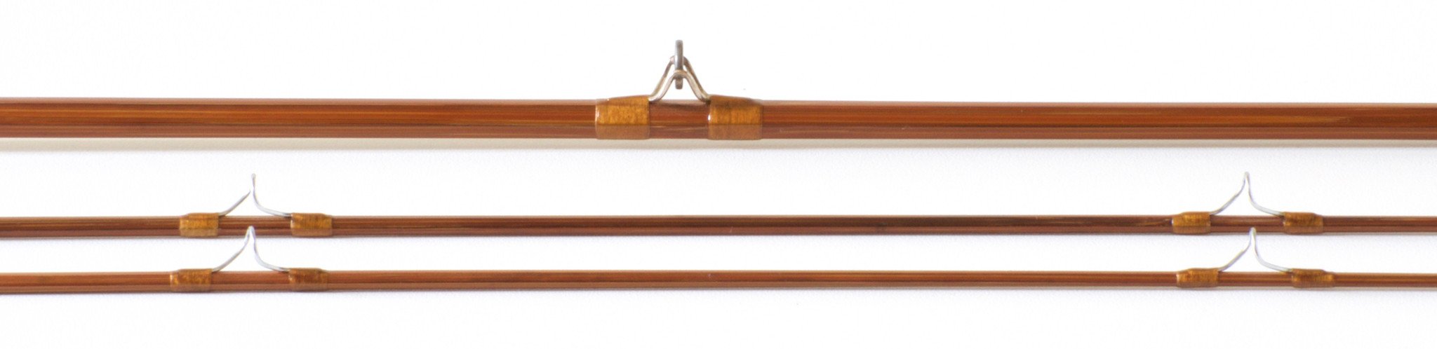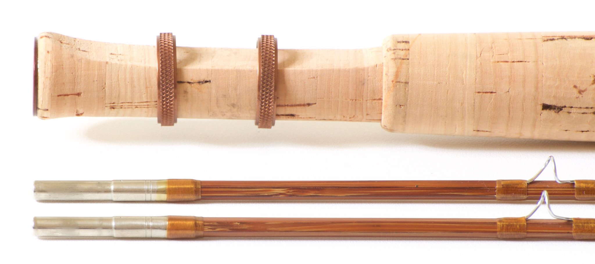 For sale here is a Phillipson Peerless 7' 5wt 2/2 bamboo fly rod. The rod is in excellent condition. The one and only issue is one of the tips being 1" short. Classic resin impregnated cane. Golden copper colored wraps. Cigar grip looks almost unused with the exception of a few water marks. Dual knurled ring reel seat over cork. The script on the rod remains as sharp and bold as the day it was written. Nickel silver ferrules size 11/64 and the fit is excellent. Witness mark indentations on the ferrules. The action is a lovely medium-fast dry fly action. Weight is 3 3/4 oz. This rod was produced during Phillipson's 3M era shortly after the lifting of the embargo with China in 1971, a notable period in bamboo fly rod making. The rod includes its original bag and a replacement tube.