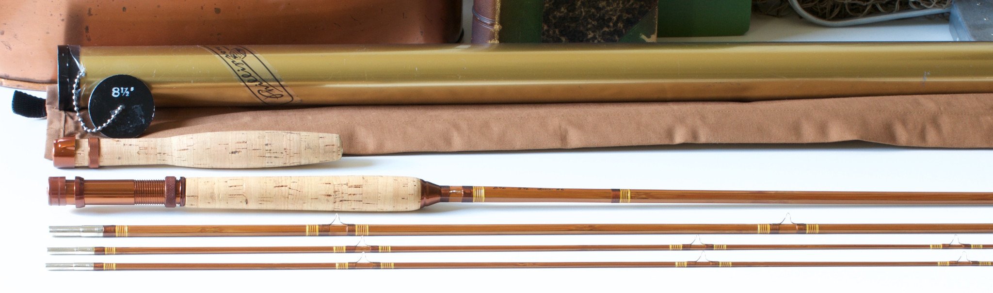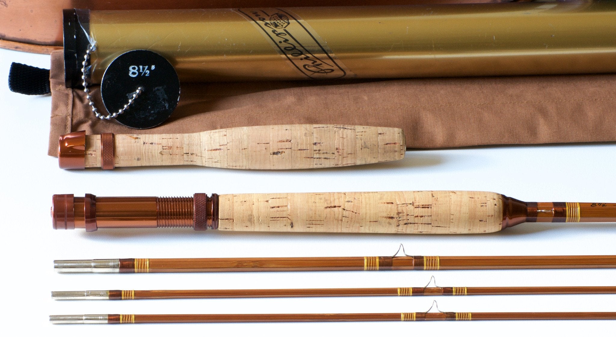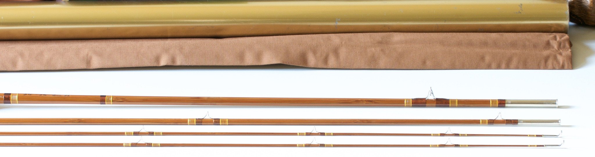The nickel silver ferrules are size 12/64 and 18/64 and fit together nicely. The rod is in near mint original condition. Strong medium fast action with a lot of backbone. The rod weighs 5.3 oz. Comes with original bag and labeled tube in very fine condition. A great Western rod capable of throwing big nasties and handling big fish, yet it also presents small dries very effectively!