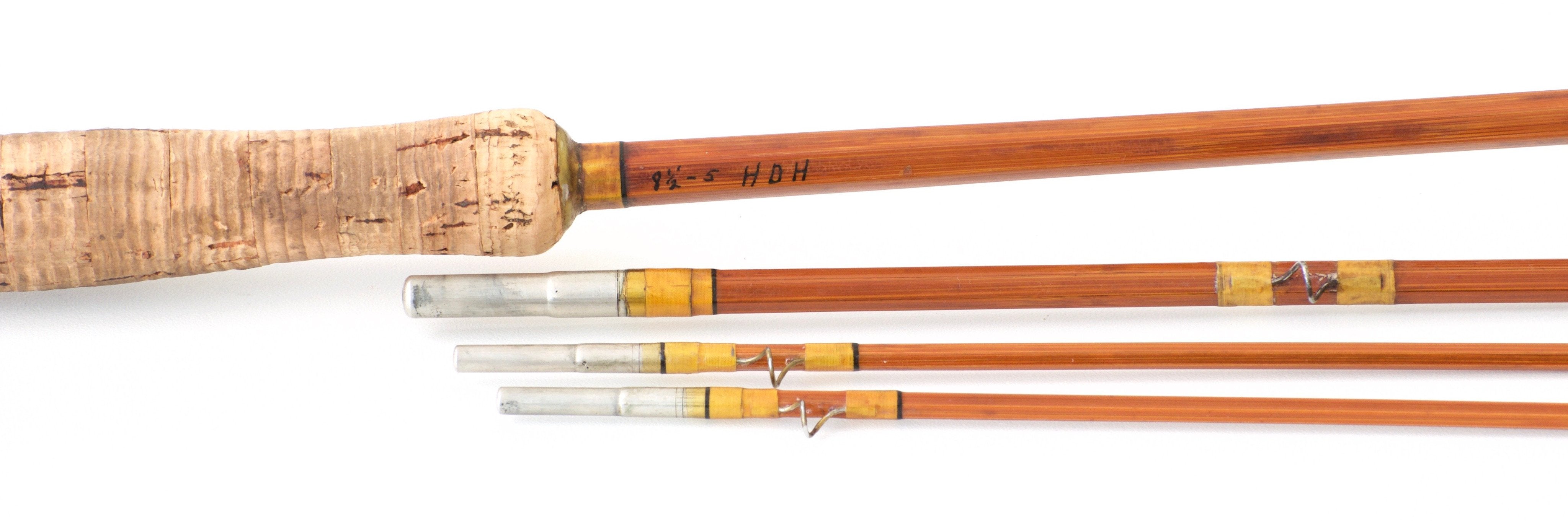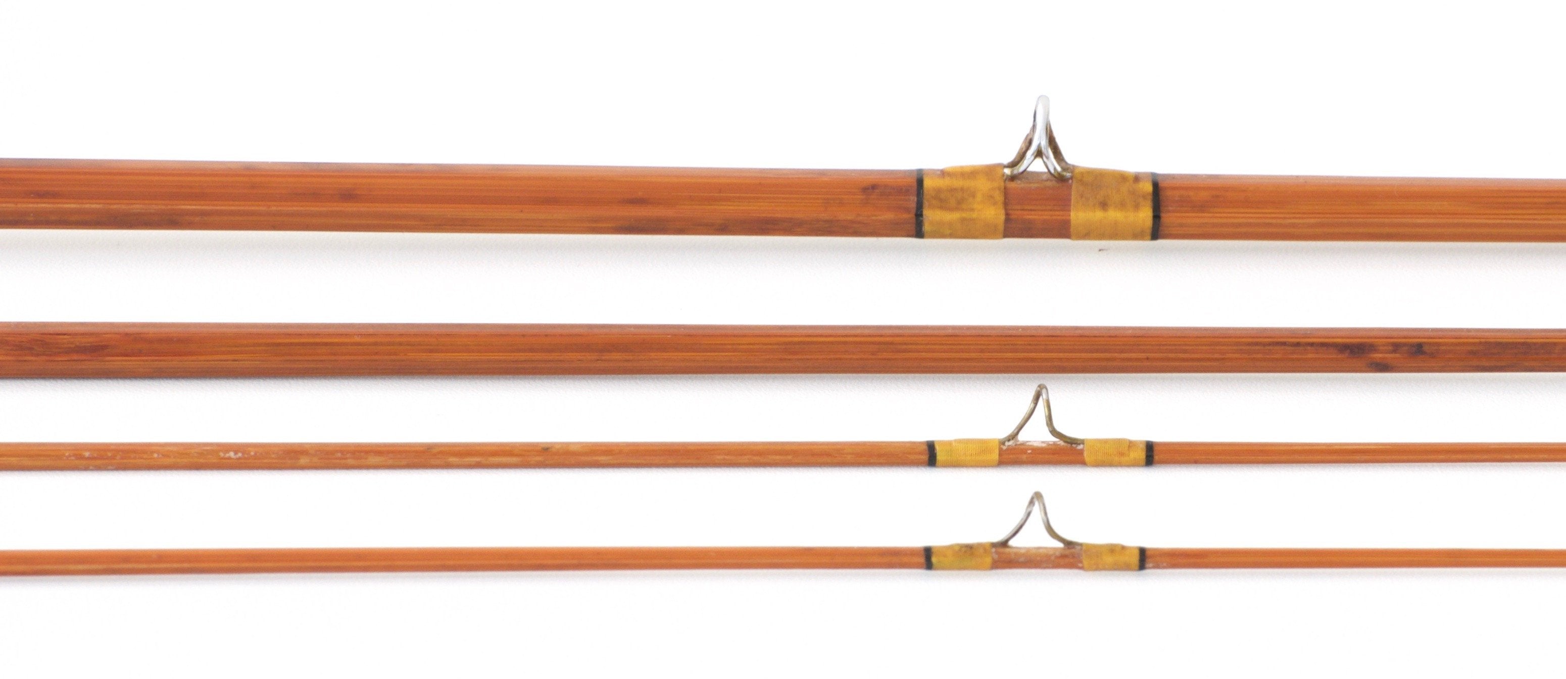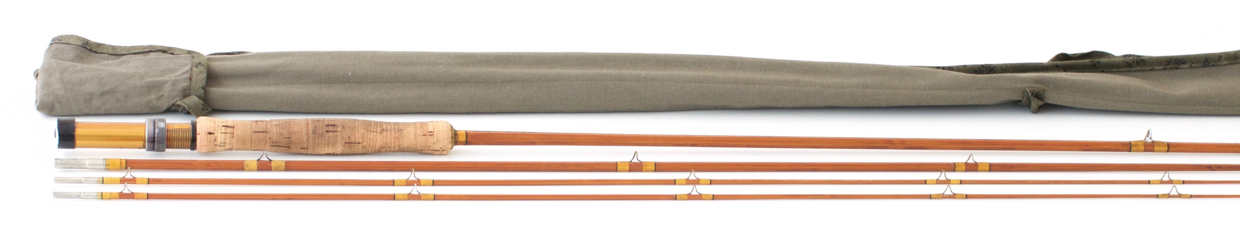 For sale here is a Phillipson Powr Pakt 8'6" 5-6wt. The rod is in very good condition though it has lived a full life. The rod is in original condition with the exception of both tips being down 1". The varnish shows light softening from humidity in a few isolated areas. There are also slight fishing sets in both tips. Dark pumpkin colored cane, gold/yellow wraps with black tipping. The script remains clean and bold. Gradually swelled butt. Aluminum winding check. Full wells grip is soiled and a bit ridged in places. Aluminum downlocking reel seat with gold anodized aluminum spacer. There is light wear around the rim of the butt cap as well as a bit of paint loss on the locking ring. The nickel silver ferrules are size 17/64 and 11/64. The fit is excellent. On the medium side of medium fast action. The rod provides a nice balance of power and finesse. The rod weighs 5.10 oz. Comes with replacement bag and no tube.