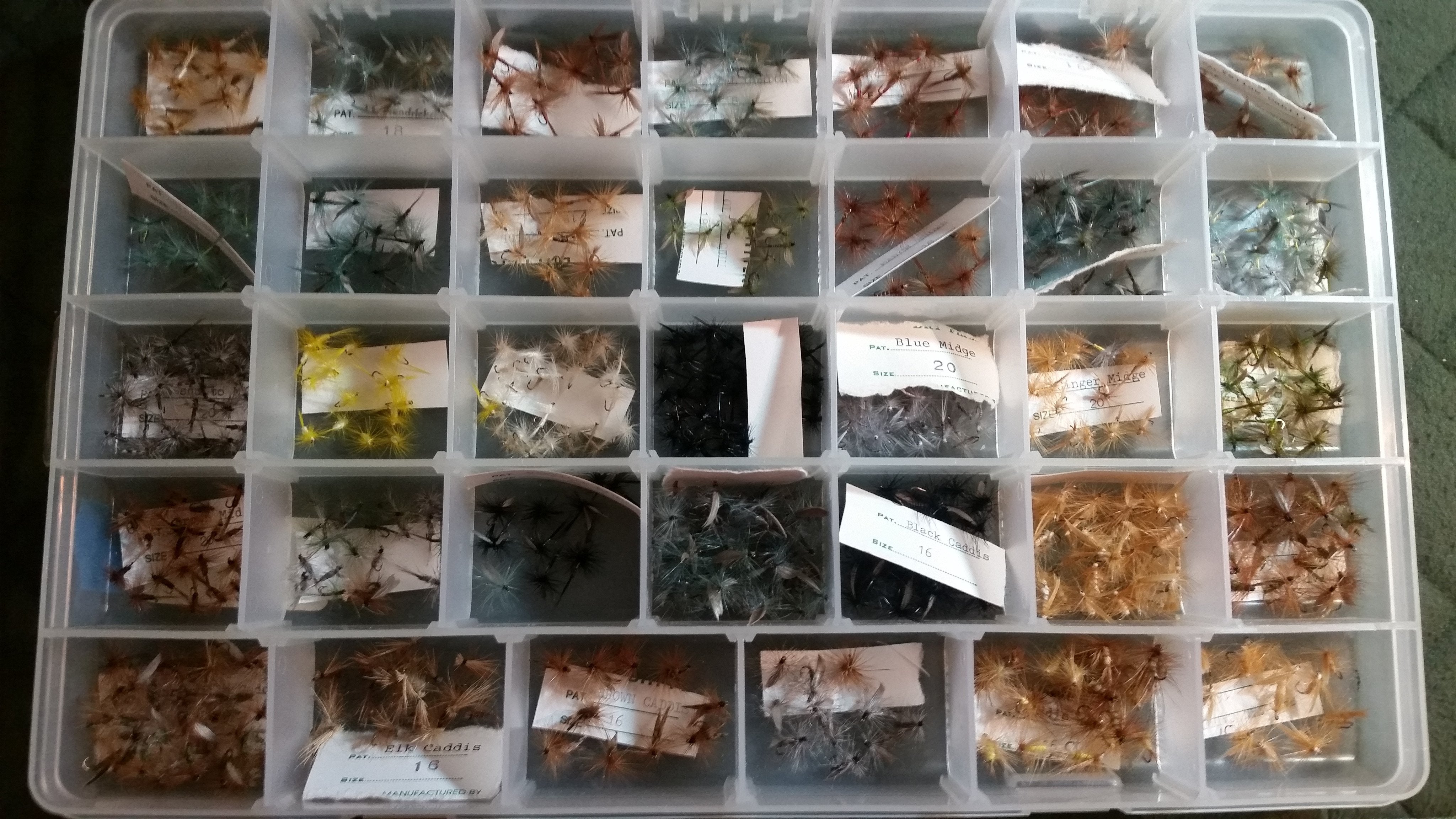 For sale here is a large Plano box filled with an excellent collection of approximately 375 dry flies. The flies are all unfished and in excellent condition. This box could last the average fisherman for several years if not longer. The Plano box measures 14" x 8 3/4" and contains 34 compartments. As stated above the box consists of dry flies ranging in size from #16-#20. The flies include but are not limited to - blue wing olive, pale morning duns, caddis of various colors, midges, ginger quills, Hendricksons, light cahills, and several more. Each of the compartments includes a small tag listing the size and pattern of the fly within. Don't miss out on this cache of flies at a fraction of the price of store-bought flies!