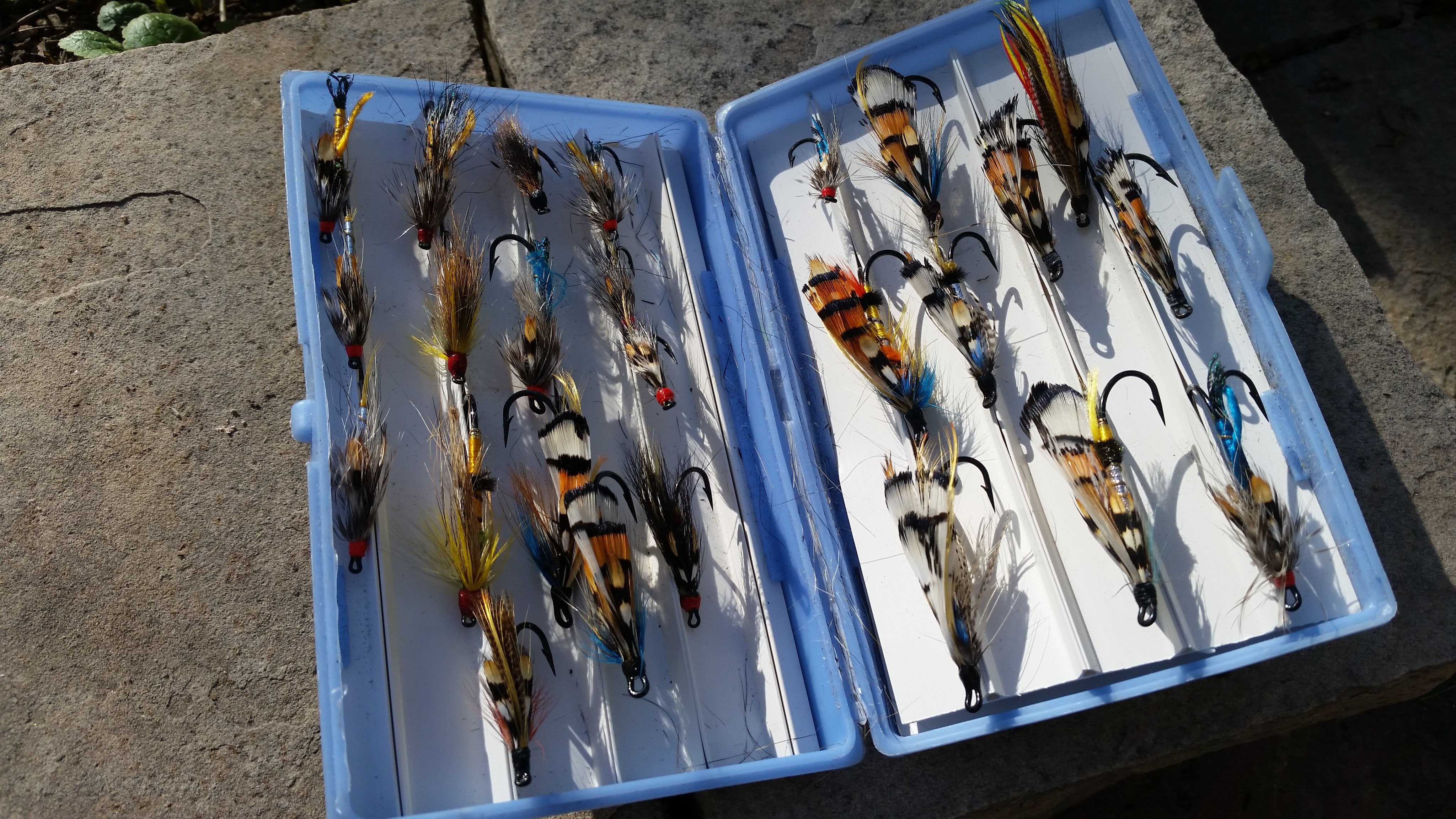 For sale here is a plastic fly box filled with salmon flies. The box is in good condition void of cracks though it has trouble staying securely closed. The box measures 3 3/4" x  6" x  1 1/8" with four slots that run lengthwise on both sides. There are approximately 25 flies, all with double hooks and tied with jungle cock feathers. The flies are in very good condition. Don't miss out on this fly box with well-tied flies at a fraction of the price of store bought flies.