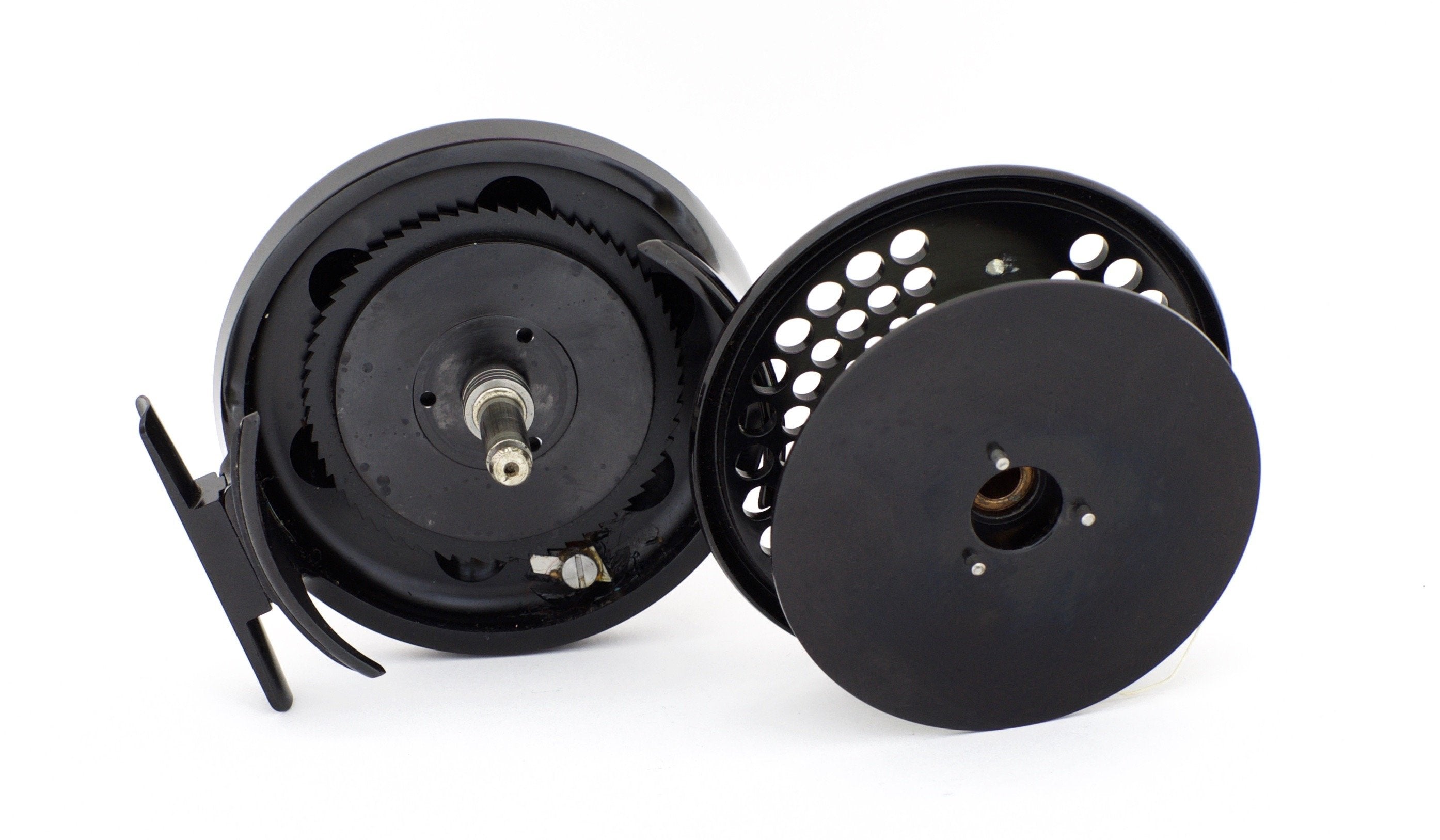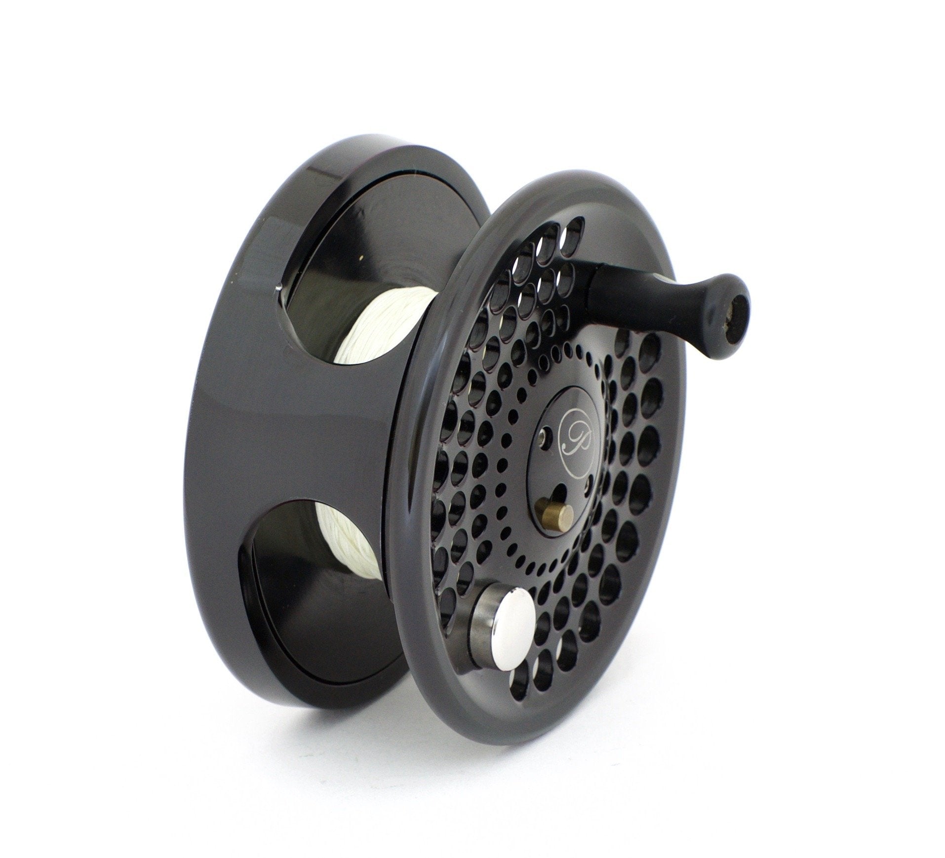 For sale here is a Precision Model 1012 fly reel. High-gloss black anodized finish, safe for saltwater use. Made in the late 1990's. Very high quality reel with very strong disc drag. Silent outgoing, very nice audible click incoming. Near condition with one small ding in the anodizing on the stripping pillar. Set up for right hand retrieve. Diameter 3.6". Spool width 1.12". Weight 13.05 oz. with the backing included. For lines 10-12. Comes with its original reel case. A very scarce reel not made in large numbers.
