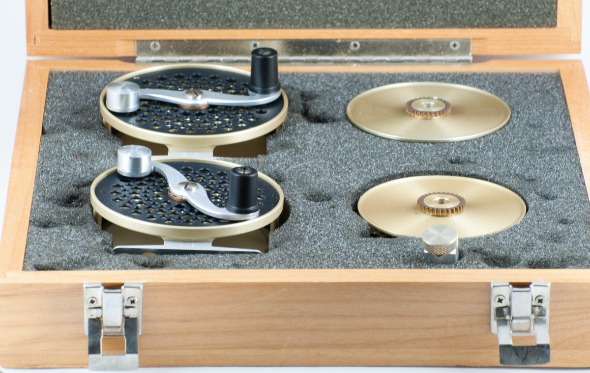 For sale here is a R.L. Winston Co. "Vintage" Limited Edition Trout Fly Reel set made in the early 1990s. These are the 3/4 and 5/6 models, complete with spare spool for each reel. Reels are in unused condition but from being in the foam padded case, they have developed some sort of tarnish on both counterbalances. They are set up for right-hand retrieve. The spool capacity for the 3/4 is WF4+80 and the 5/6 spool capacity is WF6+100. Comes in mint condition pine presentation box with reel oiler.