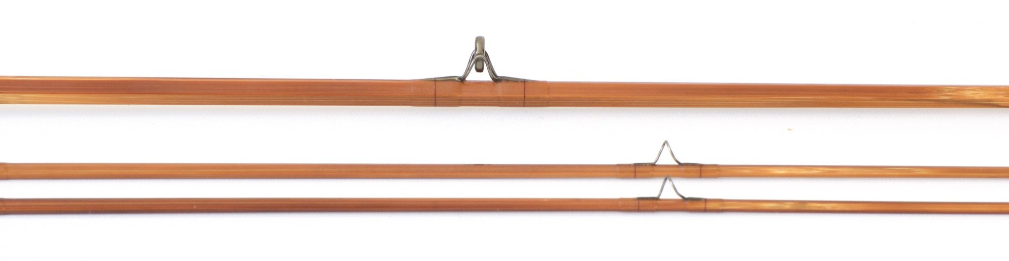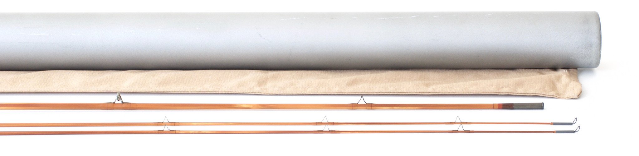 For sale here is a stunning 6'11" 4wt 2/2 bamboo rod built by Bernard Ramanauskas under the Scott Rod Co. Model SC6114. Serial #0122. Near mint condition, having been lawn cast only. 3x3 node spacing. Transparent wraps with a very fine line of burgundy thread in the middle of each wrap. Burgundy spiral signature wrap. Tips numbered 1 and 2. The rod is lightly flamed and features a slightly swelled butt. Modified cigar style grip with a slight forward taper and a fine burl cork ring at the nose of the grip. Blued nickel-silver sliding band reel seat over a beautiful burled rosewood spacer. "Scott" engraved in the blued butt cap. Blued, truncated Super-Z style ferrules size 10/64; fit is tight. Black dot witness marks for easy alignment. Very nice medium fast progressive action. The rod weighs 2.95 oz. Original embroidered bag and labeled tube included.