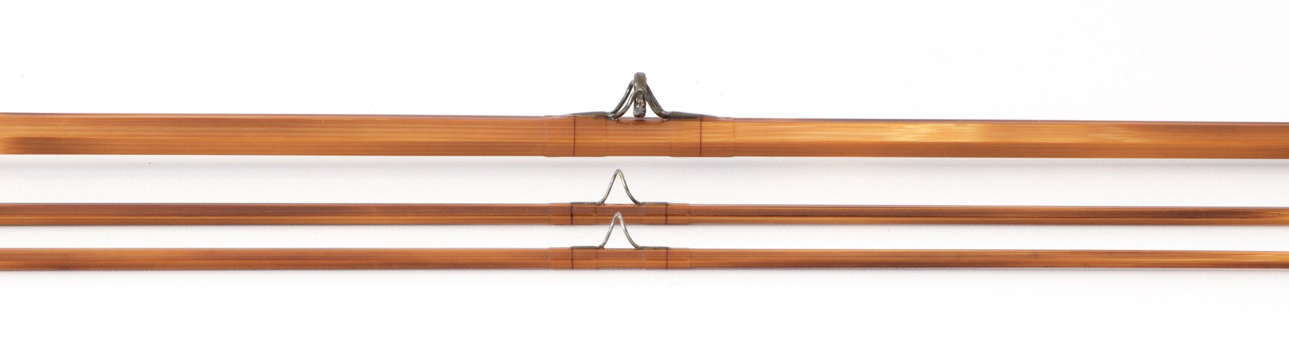 For sale here is a stunning bamboo rod built by Bernard Ramanauskas under the Scott Rod Co. - Model SC7105; 7'10" 2/2 for a 5wt line. Serial no. 1245. The rod is in near mint+ condition. All section are full length and straight. The rod is moderately tempered to a dark honey color with bright highlights at the nodes. Transparent wraps with a single wrap of burgundy thread down the middle of each wrap. Burgundy thread in a spiral pattern at the signature. The guides are lightly oxidized. Black witness dots. The tips are marked one and two for convenience. The mildly swelled butt flows into a darkly oxidized hexagonal winding check. Simple oxidized nickel silver cap and ring reel seat with a gorgeous, highly figured, mortised maple burl spacer. There is a slight blemish on the rim of the butt cap. The rod features a very nice, medium fast progressive action and weighs 3 1/2 oz. The ferrules are size 14/64 and the fit is perfect. Original embroidered Scott bag and labeled tube. Don't miss out on this Ramanauskas-made Scott rod as they don't come up on the secondary market very often!