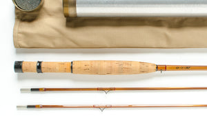 A great little R.D. Taylor 7' 2-piece, 2-tip rod for a #3 line. Beautiful flametone in color, this rod has a geat medium action. Mint unused. Marked 24 3-187 on shaft and constructed in a 2 opposed node pattern. Wrapped tan with red edges. Keeper 1 flat right. Medium cigar grip and nice all cork grip. Rear cork check and Bob's excellent handmade cap and ring. Cap logo stamp reads "R.D., Taylor, maker". Step ferrules are oxidized.I can't see any sign this rod has been cast. Please note: there is some dust in the varnish of all sections. Ferrules are tight and all sections straight. This rod is fast enough to be very accurate and slow enough to qualify for the term "sweet". Correct bag and brushed aluminum brass topped case.