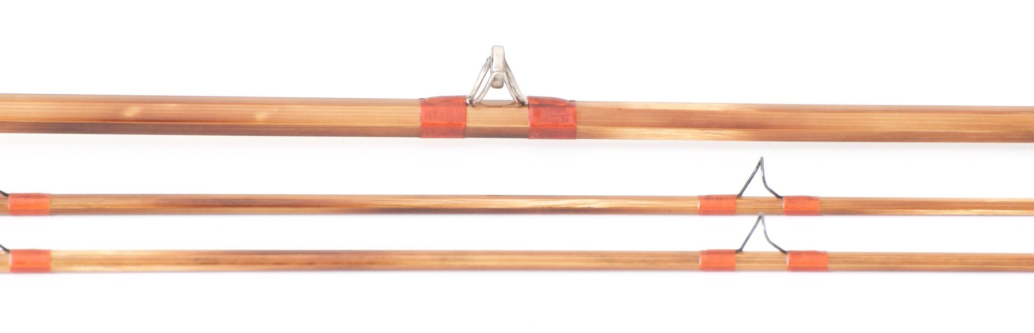 For sale here is a new hand planed rod built by Joe Balestrieri of Redwing Fly Rods. The "Type Speedcast" model - 7'11 1/2" 2/2 for a 5 or 6 weight line. Weighs 3.8 oz. The rod is in new condition. All sections are straight. The rod features mottle-flamed shafts with deep orange silks and black silks at the ferrules. 3x3 node spacing. Gloss spar varnish. Oxidized hardware. Light wire snake guides. Black agate stripping guide. Tips are marked 1 and 2. 7" tapered cork grip. Handsome cap and ring reel seat with a Japanese spruce burl spacer. Blued n/s type "Z" ferrules with an excellent fit. The action is a medium-fast with a good bit of backbone. Joe based the taper design on a quicker, more powerful Pezon et Michel Speedcast taper. The rod excels at fishing big water with lots of wind and/or long casts. Includes original bag and Cabela's cordura tube.
