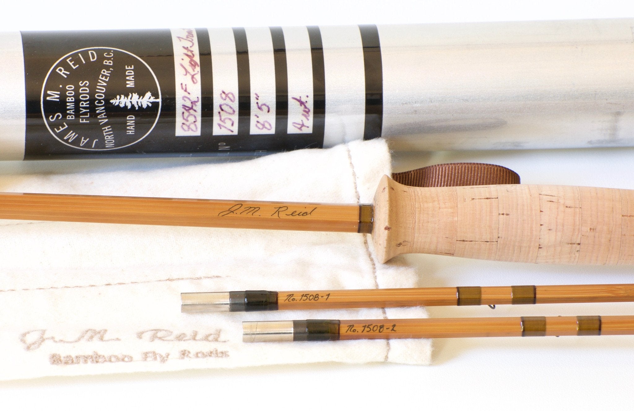 For sale here is a James Reid 8542F 8'5" 4wt 2/2 bamboo fly rod in a rarely seen ferruled configuration. The rod is in excellent+ condition. The rod is described as a "Light trout" model on Reid's website. The rod features medium-light colored cane with an impregnated finish. 3X3 node spacing. Olive colored wraps with black tipping. Blued hardware throughout. Salmon colored agate stripping guide. The grip shape is Reid's signature modified full wells style, sometimes described as "evening gown". The grip is in excellent shape with very little soiling. Nickel-silver cap and ring reel seat with a very handsome stacked, mortised bamboo spacer. The rod has an understated beauty, not at all flashy. The Swiss-style truncated ferrules are size 13/64. The fit is nice and tight as it should be. The action is on the faster side of medium-fast and the perfect balance of authority and delicacy, truly a well-rounded light trout rod. Serial number 1508; tips numbered 1 and 2. The rod weighs in at 4 1/4 oz. Comes with original J.M. Reid embroidered rod bag, and original rod tube with label. An outstanding trout rod from an exceptional modern maker.