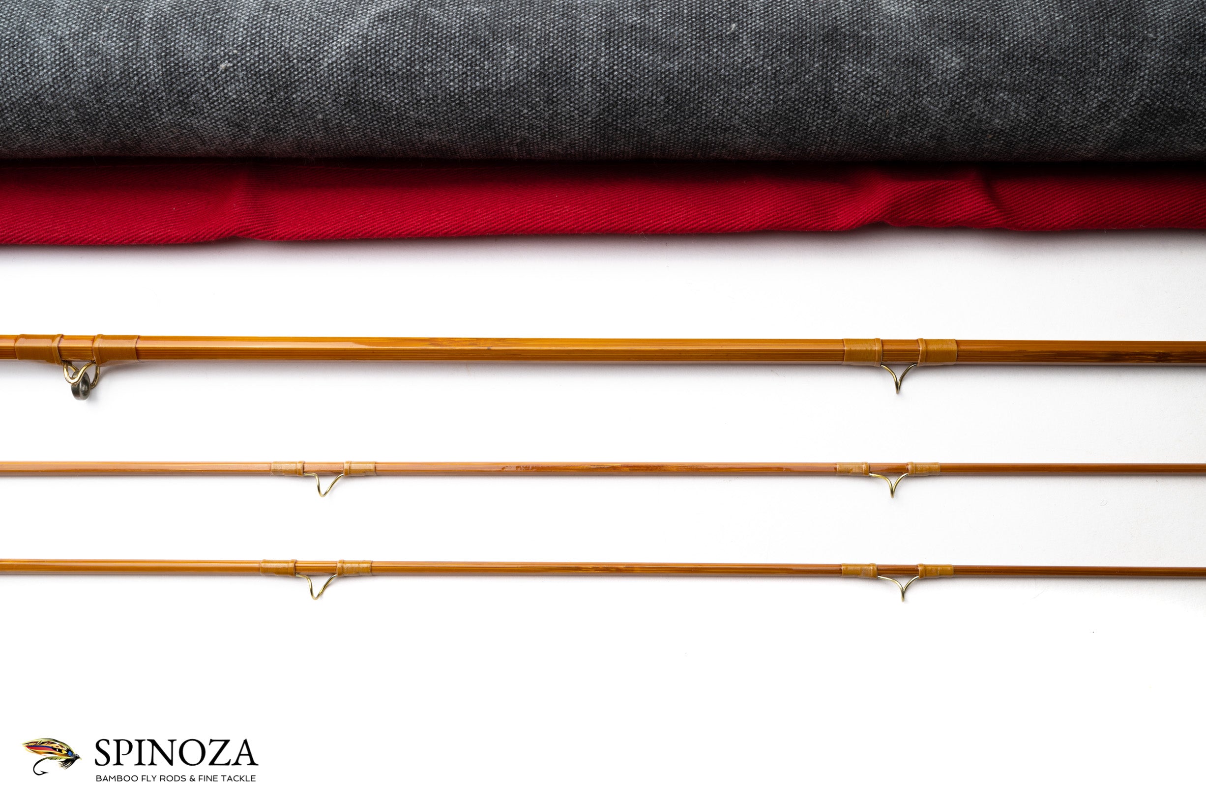 A nice RL Winston bamboo fly rod, 8'6", 2-piece, 2-tips, and built for a #4 or #5 line. Serial #1314. The rod weighs 4.2 ounces. Medium slowish action. San Francisco era rod. Tan color cane done in a three up node pattern. The original owner's name is inked on the shaft. The rod does not appear to have seen much use. The grip is clean as a whistle. The wraps are the light tan putty color with maroon edges at the keeper, ferrules, and tip tops. Carbide stripping guide and chrome snakes. The ferrules have the trademark overwraps. The grip is 6" and shaped to a full wells profile. The seat is a downlocking screwlock with an aluminum nut and pocket cap. The rod packs into a red cloth bag and the tube has the original logo sticker and protective cloth overbag.