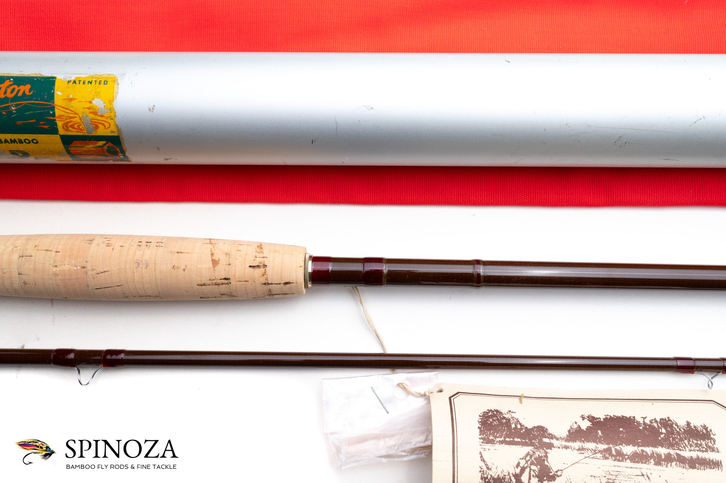 A very nice RL Winston fiberglass rod, 8'6", 2-piece, 1-tip and built for a #4 line. This is a San Francisco era model made before the move to Twin Bridges in 1977. No serial number. Medium-slow full flexing action. The rod appears to be unfished and still has the Winston paper hang tag and small pouch containing a bit of ferrule wax both tied to the keeper. Sanded burgundy blank with a spigot ferrule, and the rod sports the Winston San Francisco Champion Cup logo halfway between the grip and the stripping guide. Cap and ring reel seat over a cork spacer. The rod packs into a bright orange bag and the original aluminum tube with the Winston logo sticker affixed to it.