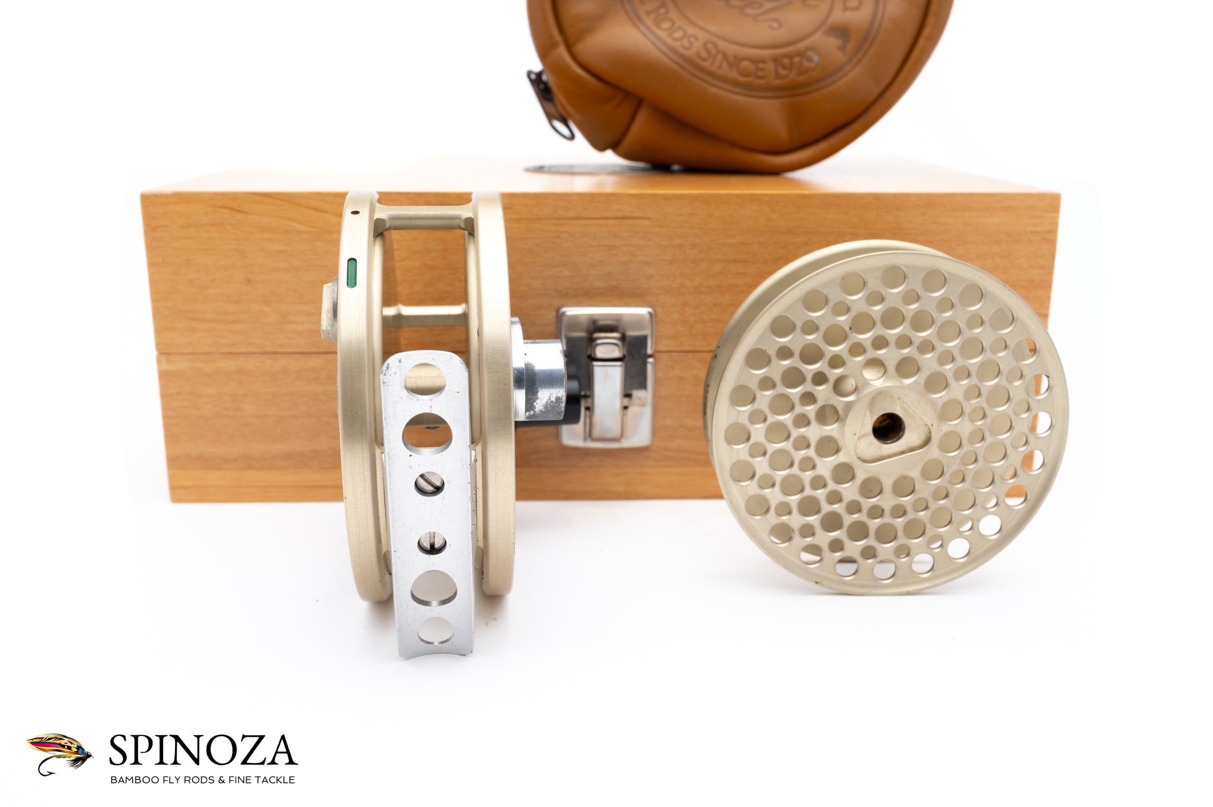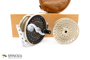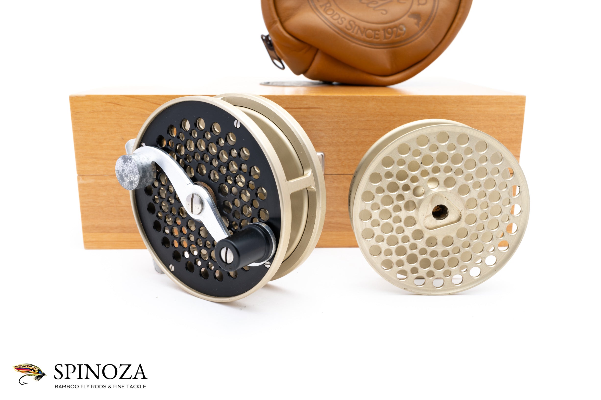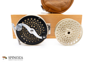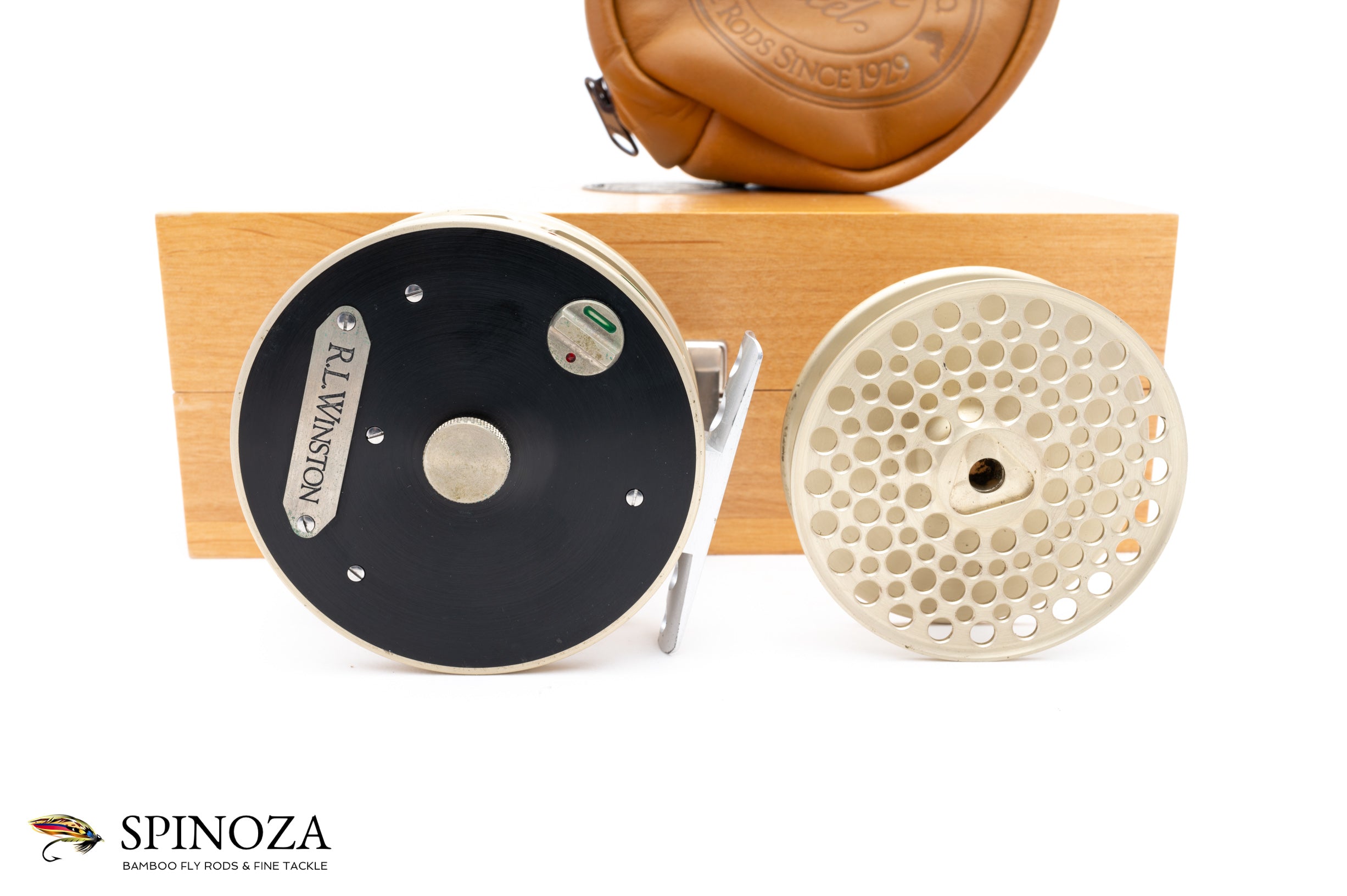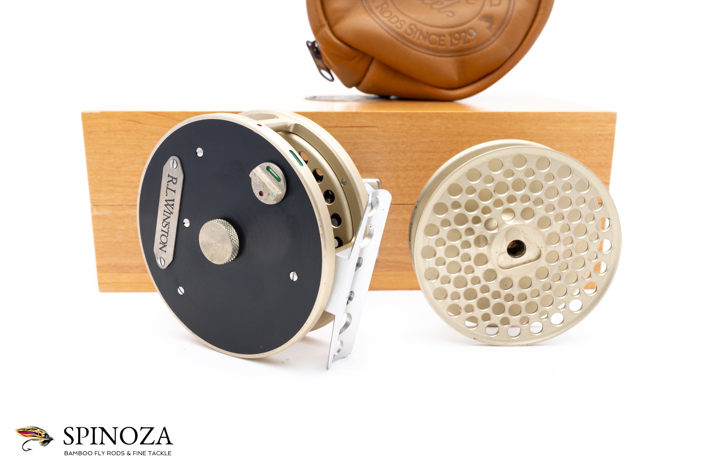 A nice Winston vintage 3/4 model reel, 3 1/8" diameter with a spare spool. RHW. Marked 3/4 on the side of the foot. Good used condition with some minor bits of rim rash, small mounting marks on the foot, and some tarnish to the counterbalance. The spare spool shows some very minor wear. Black anodized sideplates (the crank side is ported, the face side not). Silver serpentine handle and silver perforated foot. Gold rims, drag adjuster, and oil port cover. R.L. Winston stamped on a plate screwed to the back plate. Packed in a varnished wood box which has had the foam insert removed (a good thing, in my opinion, as the foam deteriorates badly on these). The Winston medallion on the top of the box has the original owner's name engraved on it. The reel comes in a leather zip pouch with the Winston seal embossed on the top and there is also the small oil container in the box as well. These reels were produced by Winston while Tom Morgan was still the owner and are a very nice addition for the Winston fan.