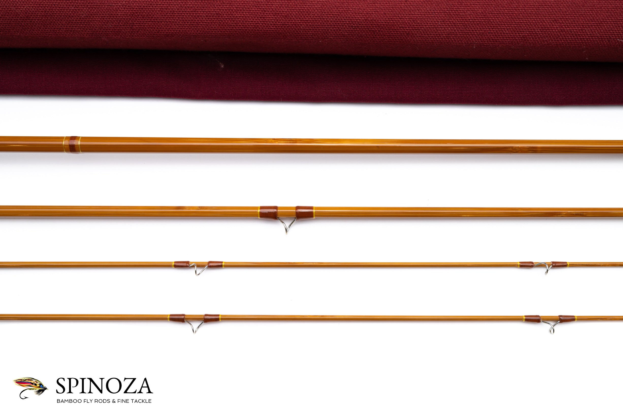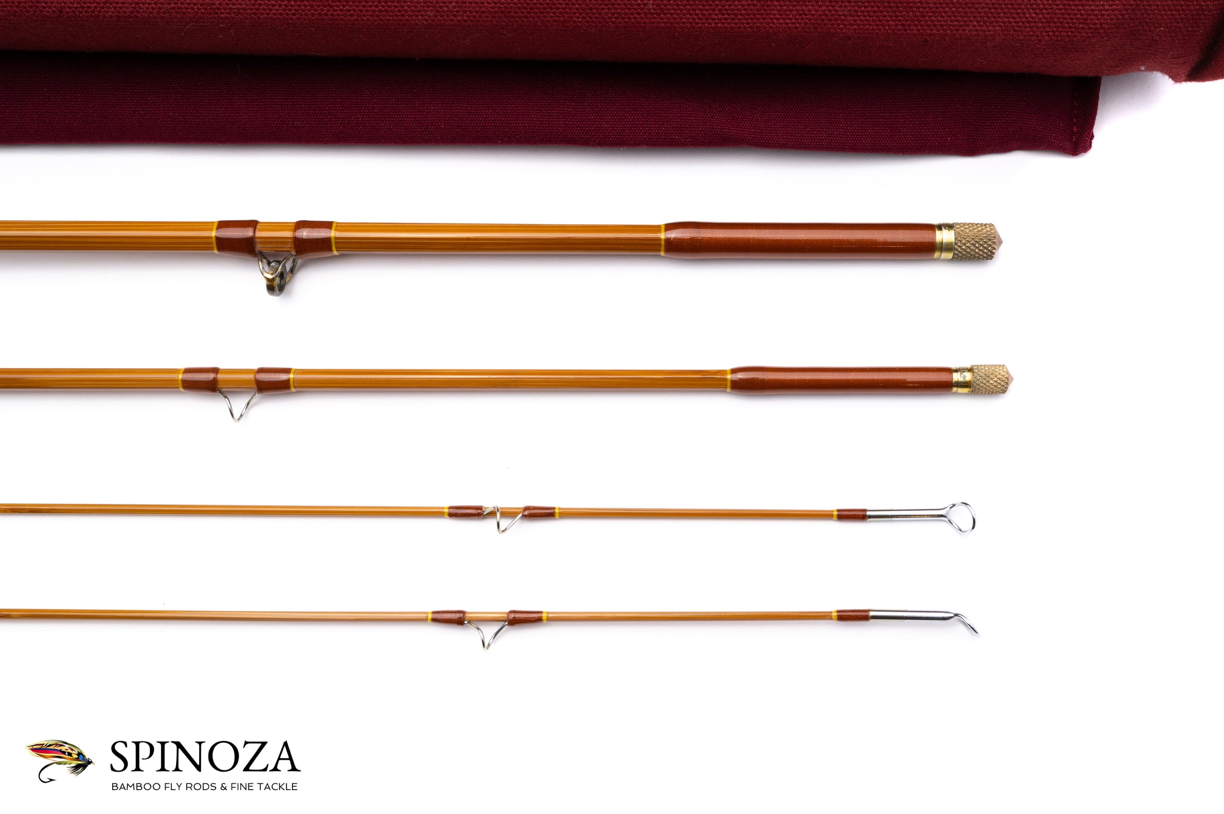 A nice Robert Bolt bamboo fly rod, 8', 3-piece, 2-tip, and built for a #5 line. Serial #1007. The rod weighs 4.1 ounces on my scale. Mint, unused condition. Nice DF action, quick but not too quick. Oven tempered cane that's a chestnut color, and done in a two opposed node pattern. Brown main wraps with yellow edges on all, with one band of red at the keeper. Carbide stripper and chrome snake guides. The ferrules are overwrapped to the welt and the welts have a tiny "RK Bolt" roller die. The rod comes with brass and cork ferrule plugs. The varnish is superb. This rod was built in 2010 and hollow built through the butt and mid. The grip is 6" long and turned to a western profile with a hidden pocket cap. The uplocking screwlock seat spacer is a perfectly varnished quarter-sawn piece of zebra wood. The polished aluminum screwlock is stamped "RK Bolt, Maker" and the bottom is nicely radiused. The cloth rod bag is maroon and the aluminum tube has Bob's data sticker and a cloth protective overbag.