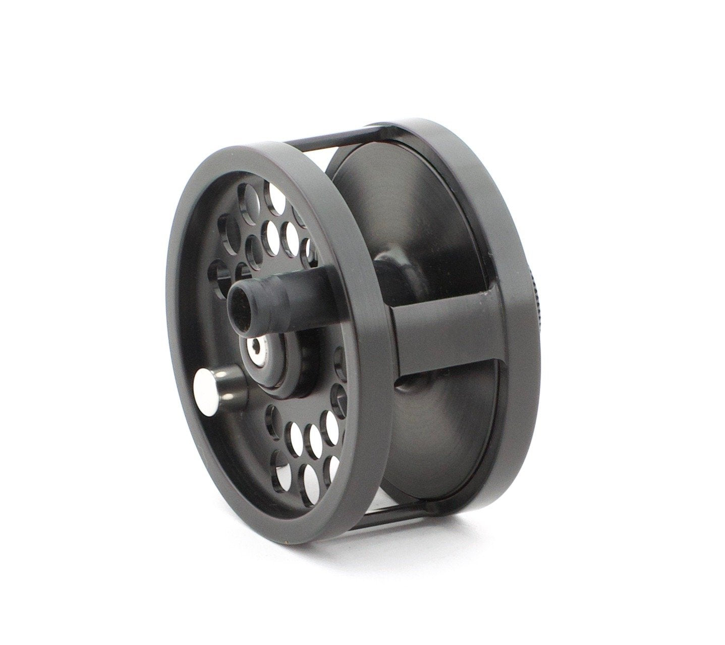 For sale here, we have a rarely seen Robichaud No. 7 "Salt" fly reel and two spare spools. Serial no. 005. The reel and spools are all in excellent++ condition. Set up for right hand retrieve, but is user convertible to left hand retrieve if desired. Incoming click and outgoing cork disc drag. The drag is adjustable, providing solid tension should one desire. The reel diameter is 3 1/2” with a spool width of 1 1/16”. The reel weighs in at 9.30 oz. Includes original leather pouches with embossed Robichaud logo.