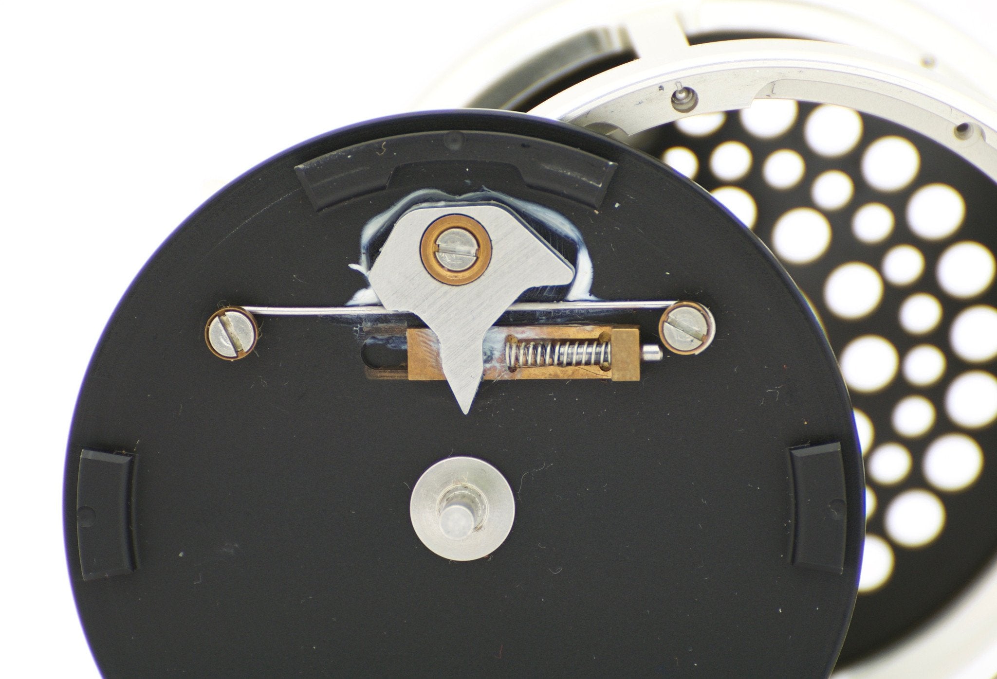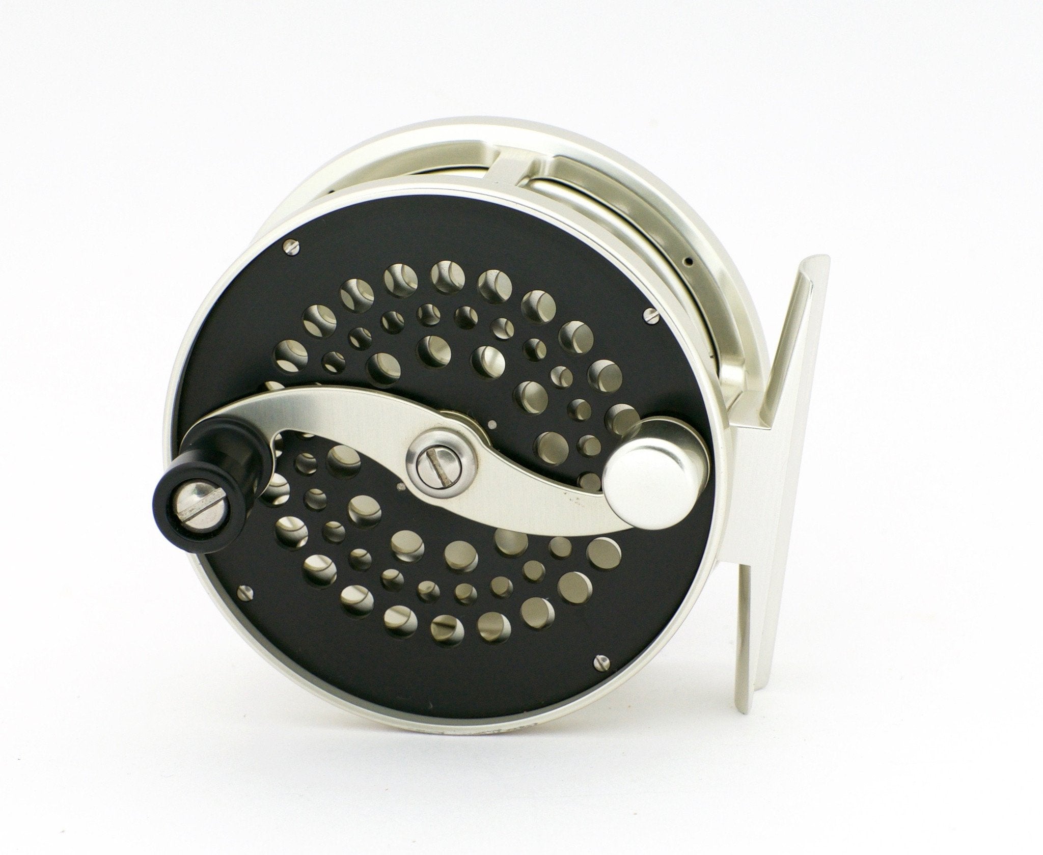 For sale here is a D.L. Robichaud #5 Traditional Trout fly reel and two spare spools with removable back cover. This spool removal method is very easy and a very nice feature with these reels. In the once crowded field of classic S-handle styled reels being made, I have to admit that these Robichauds are my absolute favorite choice, given their cost to quality ratio. Mint condition and left hand retrieve. Traditional fixed click/pawl. Made to hold a 5wt line plus backing. 3" diameter. Frame width is 1 5/16". Weighs 4 1/2 oz. Two spare spools included with the sale.