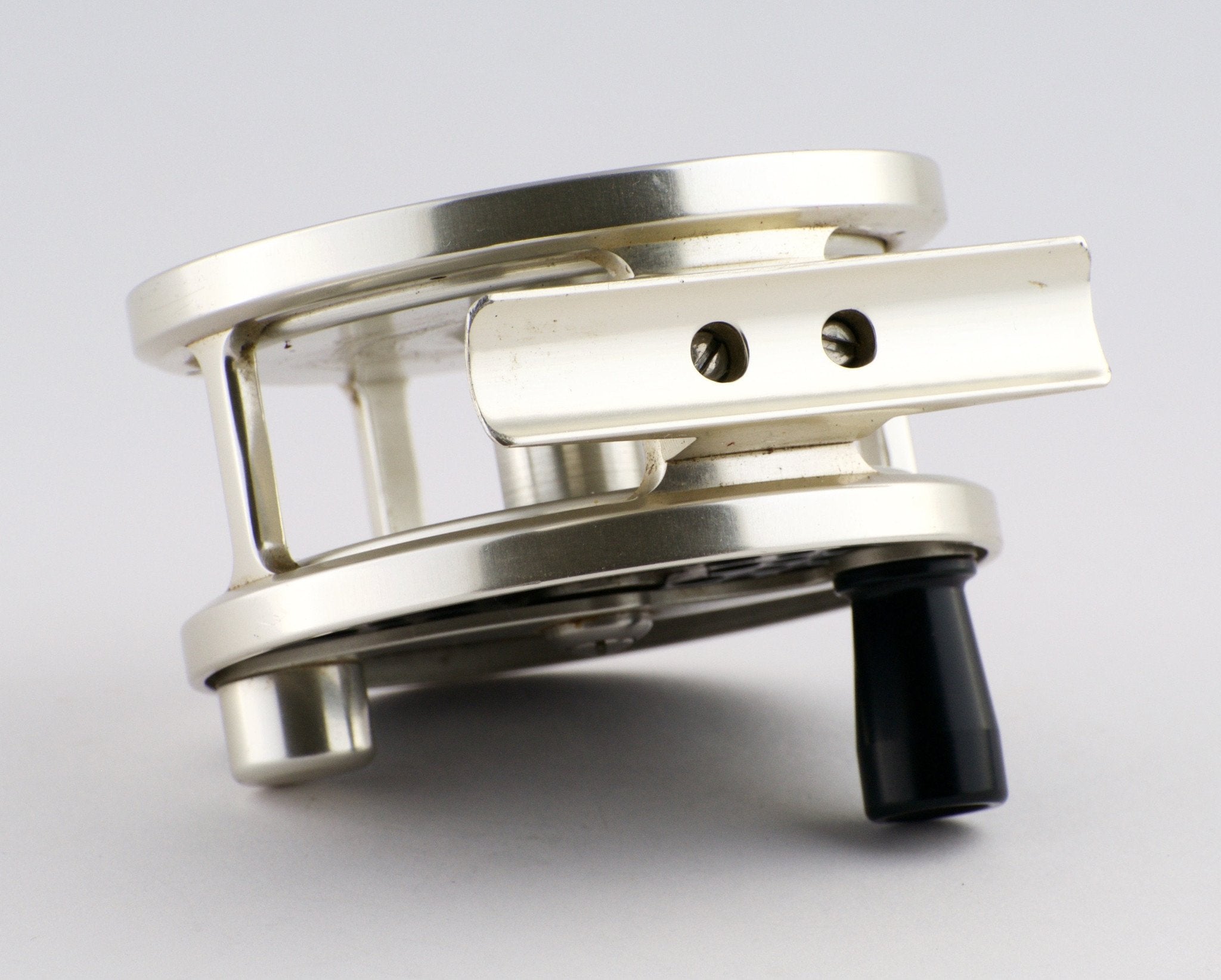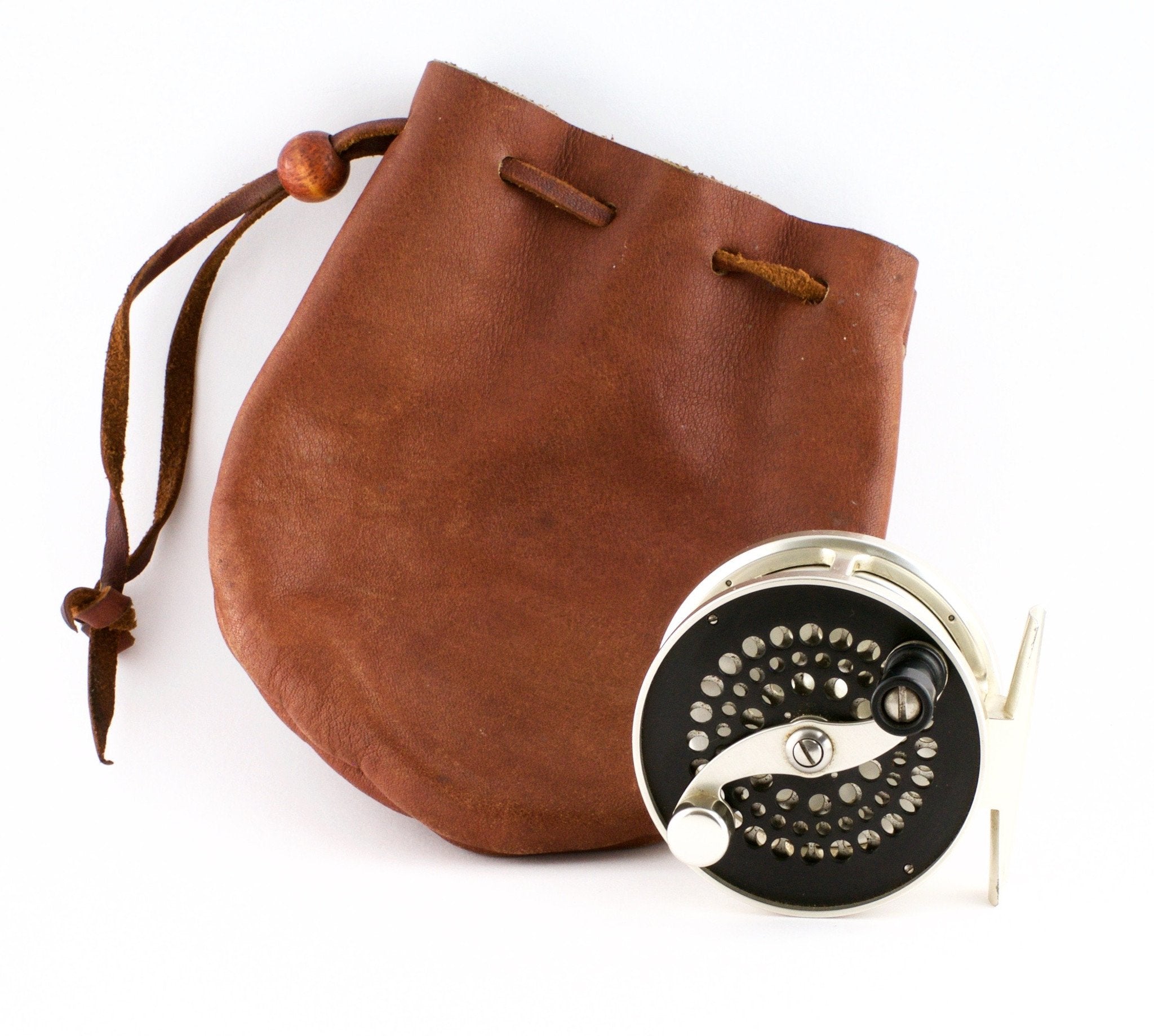 For sale here is a D.L. Robichaud Traditional Trout fly reel with fixed back cover. Model #4. Excellent used condition. Left hand retrieve. Traditional fixed click/pawl. Made to hold a 4wt line plus backing. 2 3/4" diameter. Frame width is 1 5/16". Weighs 4 1/4 oz.