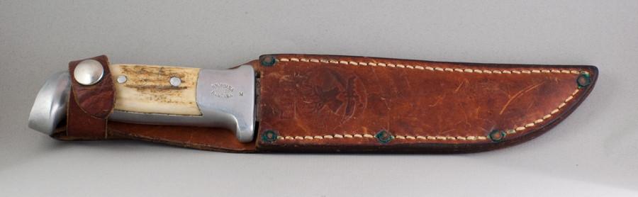 For sale here is a Ruana knife - Sticker 16A model and original leather sheath - marked with a "M". Both in excellent condition. This model is no longer offered in the Ruana lineup. The blade is full and unpolished. One piece cast aluminum handle, with standard elk horn inserts and fastened with two pins.