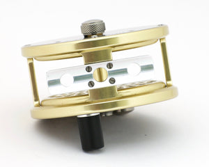 For sale here is a Joe Saracione 3 1/4" Mark IV Trout Fly Reel - Gold and black color scheme, RHW although conversion service is free from the factory if required. Serial no. 1291. Excellent+ used condition. Fixed check. Minor marks on reel foot and one small ding on the frame. Joe's MKIV reels are precision machined from 6061-T6 Aluminum Alloy, 300 Series Stainless Steel and Silicone Bronze. Spool width: 13/16”. Weight: 6.20 ounces.Fly line: 5,6,7 wt. Capacity: 60 yards 20# Dacron DT4F or WF5F. Comes with original box, and pouch. Joe describes this reel on his site as, "Great all round trout model for 4 and 5 wt lines on 8 ½ to 9 ft graphite rods, and 7½ to 8 ft bamboo rods." An amazing fly reel by one of the best!