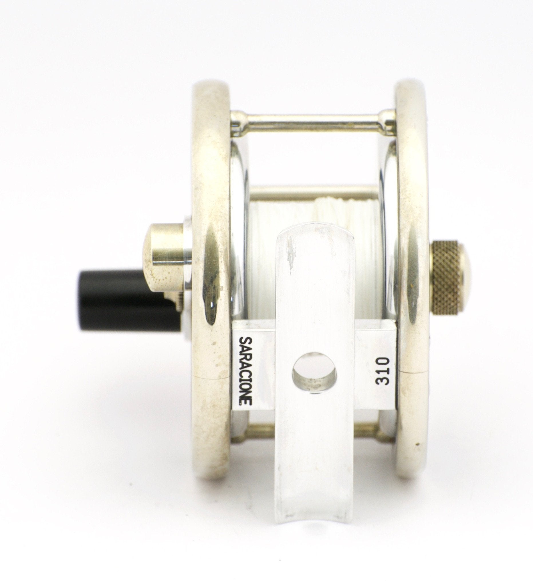 For sale here is a stunning 2 3/4" Saracione Deluxe II fly reel in near mint and slightly used condition. Left hand retrieve. Serial #310. Nickel silver rims and hard rubber sideplates. Comes with an Arne Mason leather reel case. Spool width: 7/8”. Weight 5 1/4 oz. Capacity: WF4 + 60 yds 20# micron backing. As Joe states, "This is by far our most popular trout model." A new Deluxe II reel costs $2725 currently, so don't miss out on this one!
