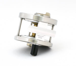 For sale here is a stunning 3 1/4" Saracione Salmon Deluxe fly reel. Near mint condition. Slight marks exist on the delrin front plate. Right hand retrieve. Stainless steel protective side bands and delrin sideplates. The spool, foot, and handle arm are aluminum. Nickel silver accents. Adjustable disc drag with bi-directional click. Comes with a fine Arne Mason leather reel case.