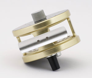 For sale here is a Saracione SCA (Saracione Classic American) -- 3" diameter bench-made reel with fixed click. Near mint condition with very minuscule marks on the reel foot. Right or left hand retrieve and user convertible (currently set up for right hand retrieve). Gorgeous S-handle, black anodized aluminum sideplates and unique removable spool system. These reels were made from 1985-1988 and are almost impossible to find in this condition. The 3 inch model is also one of the most difficult to locate. Spool width is 0.80". Weight is 6 1/8 oz. Designed for a 5-6 weight line plus backing. Comes with its original neoprene reel case.