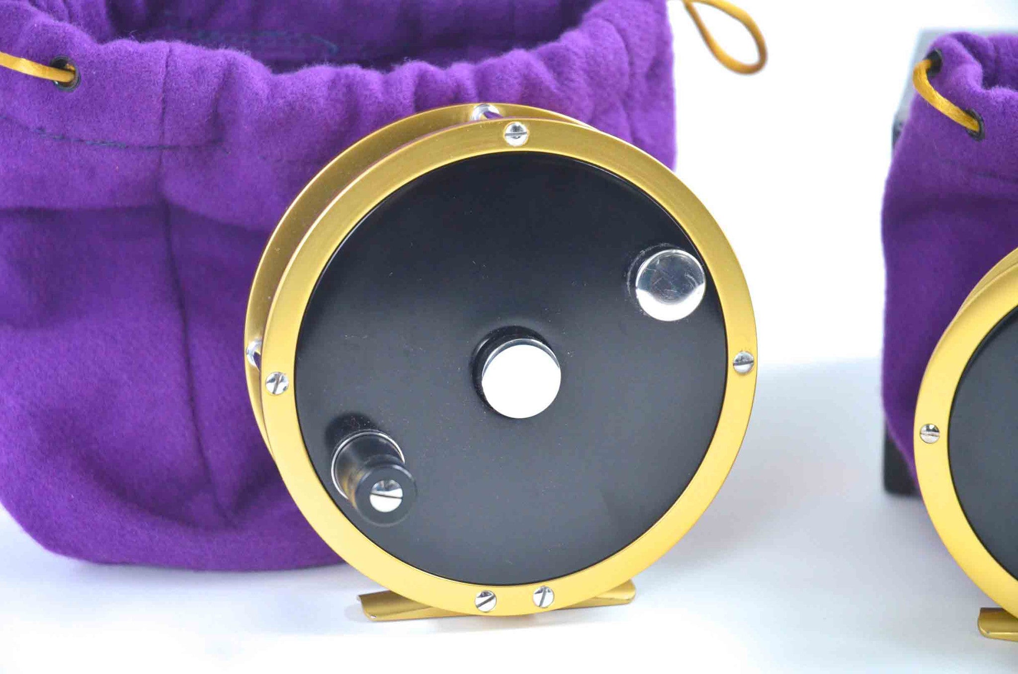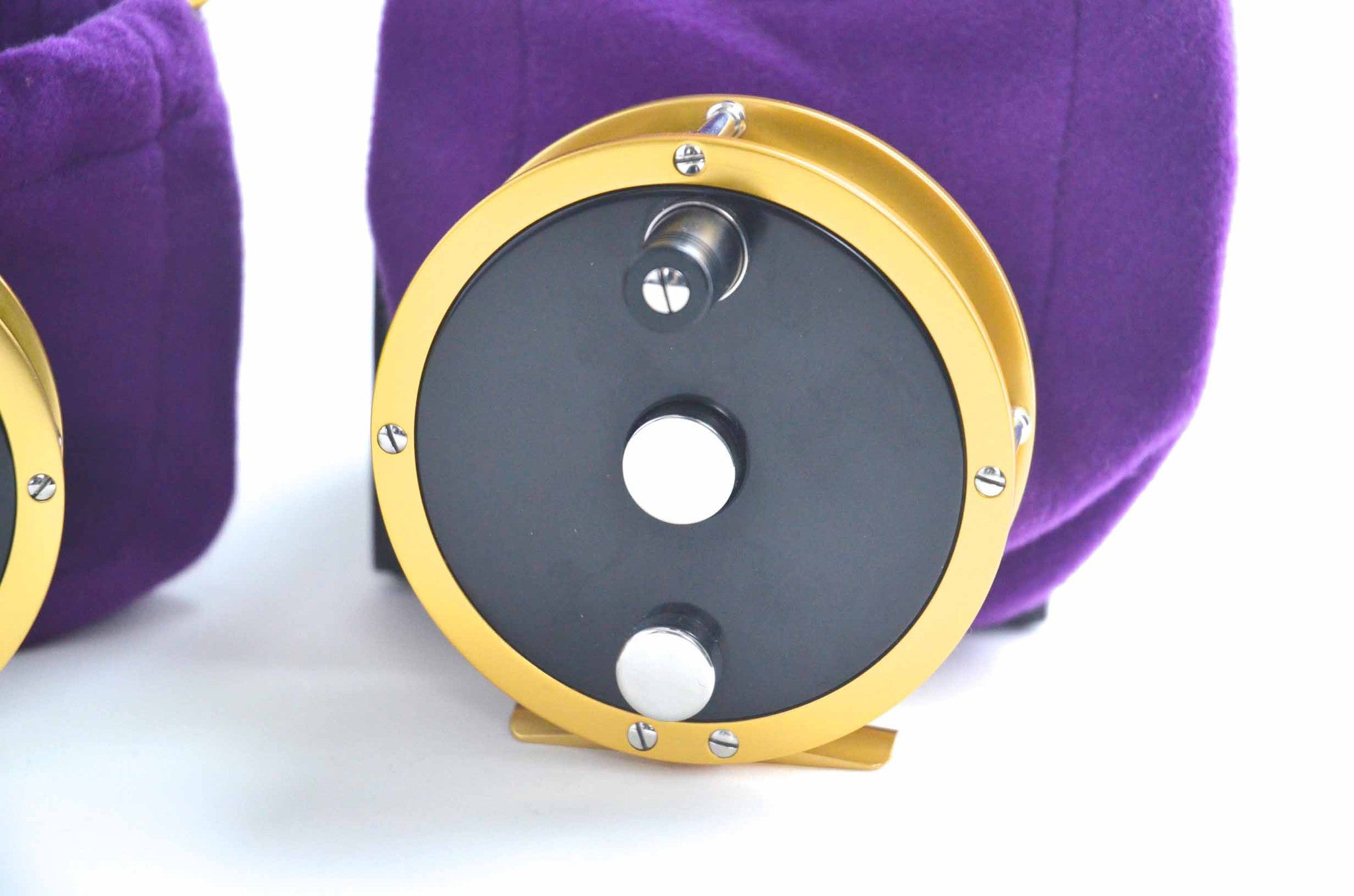 From the shop of noted reelmaker Joe Saracione comes this extremely rare limited edition set of saltwater reels - the "Bonefish", the "Permit", and the "Tarpon" - one of only 20 sets that Joe produced. This set is #3, and was constructed as an homage to the classic Gar Wood "Wedding Cake"style reels built by Fin-Nor. Each reel in this set is black and anodized gold, constructed with cork disc drags, an outgoing click, and are set up for right hand wind. The Bonefish is 3 1/2" in diameter with a 1" spool width, the Permit 3 7/8" in diameter with a 1 1/16" spool width, and the mighty Tarpon has a 4 1/4" diameter with a 1 1/8" spool width. These sets are increasingly difficult to find in their entirety, and all of these come in their original boxes, purple drawstring pouches, and with Joe's warranty card and information. An excellent opportunity to pick up some truly unique reels from one of America's very best reelsmiths.