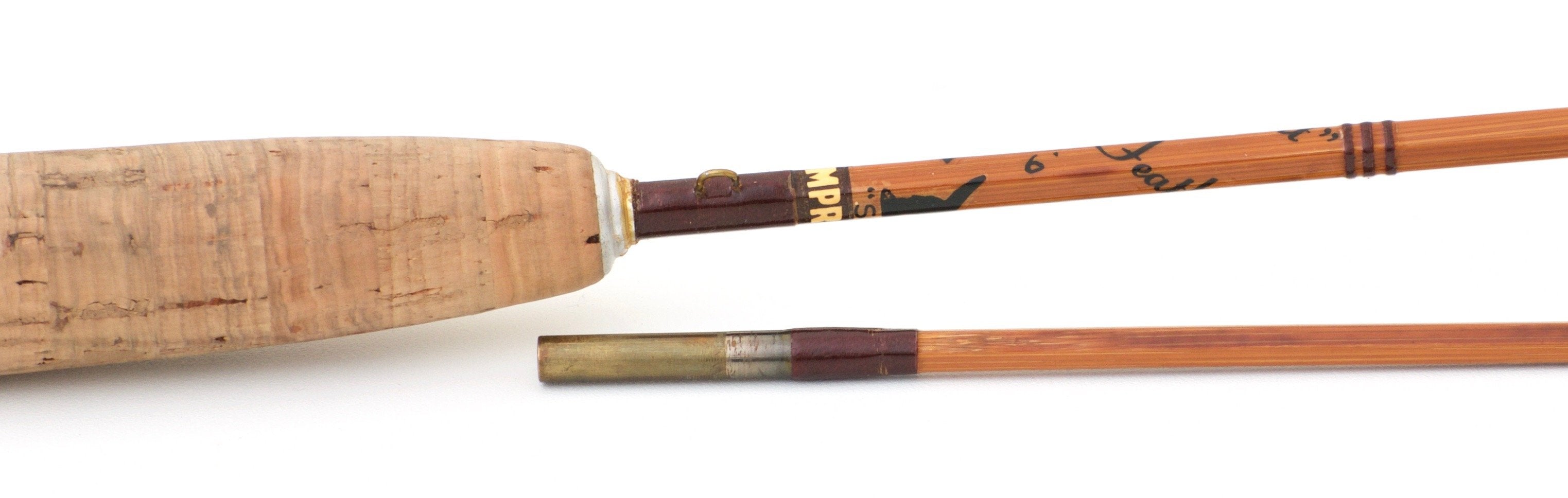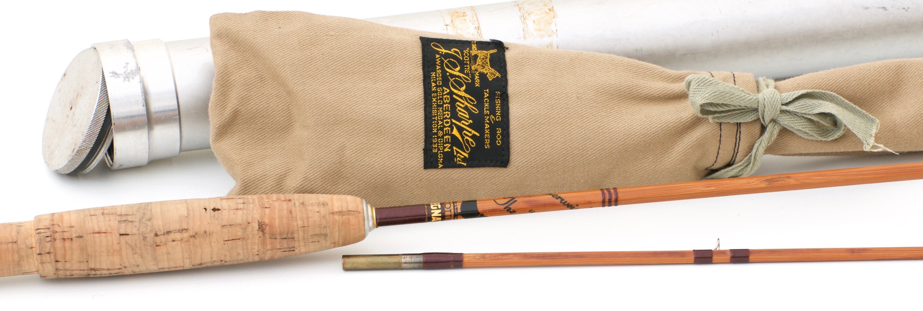 Mahogany wraps. The decals and script remain clean and bold free of any defects. The cigar-style grip is 4 1/2" in length with only light soiling. Aluminum cap and ring reel seat over a cork spacer. The stamped on the butt cap reads, "J.S. Sharpe LTD Aberdeen". The Swiss-style ferrules are size 12/64 with a great fit. The rod weighs 2.55 oz. Medium fast action.