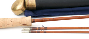 The rod features the familiar moderately tempered impregnated Phillipson blanks, chestnut silks with gold tipping, and a red agate stripping guide. Blued hardware. The butt is ever so slightly swelled. The script remains bold and clean. Full wells grip 6 1/4" in length with only light soiling. Elegant cap and ring reel seat over a beautifully figured mortised wood spacer. There is some wear to the bluing on the ring, butt cap, and reel seat check. The swiss-style ferrules are size 13/64 with an excellent fit. The rod weighs 4 3/8 oz. The action is on the medium side of medium-fast with an excellent balance of power in the butt to finesse in the tips. A wonderful all-around trout rod. The rod includes the original bag and tube as well as a guaranteed tune-up when needed from Mike for the life of the rod.
