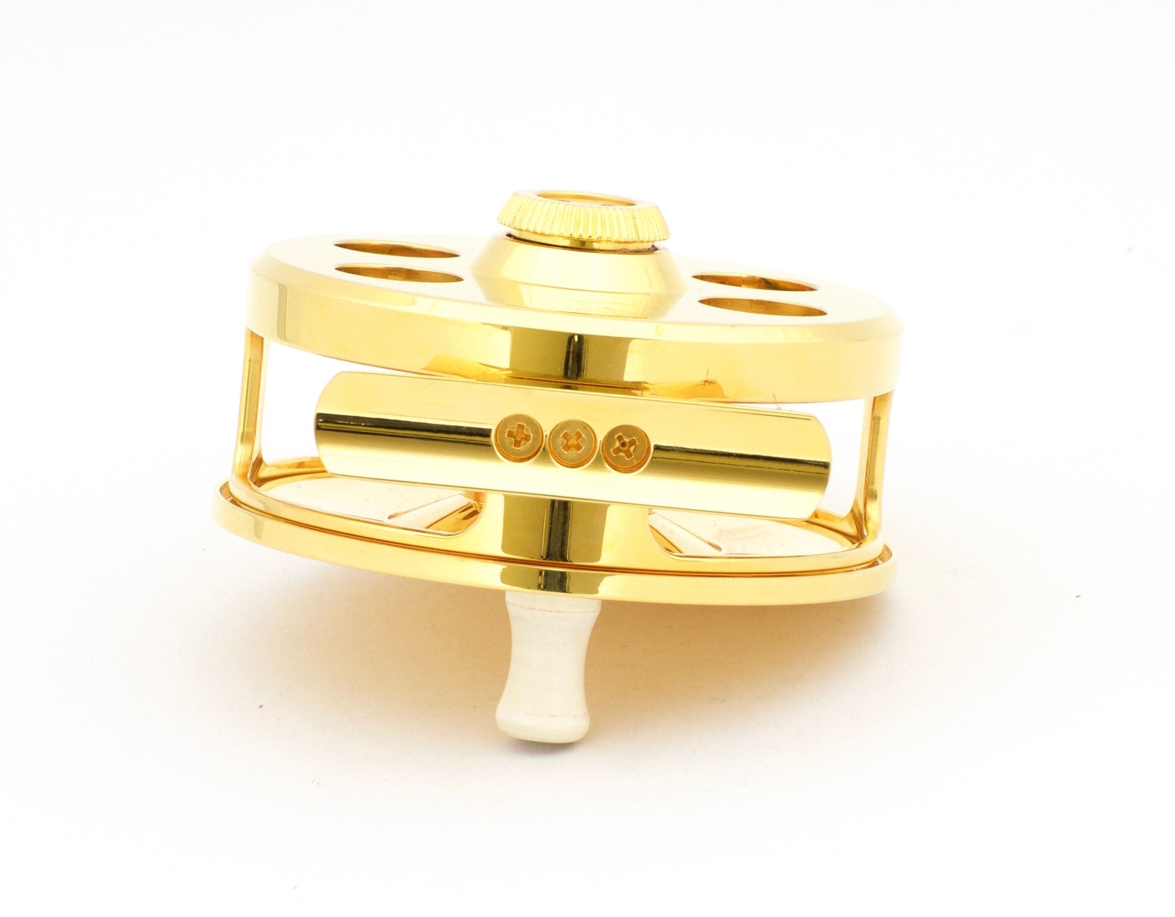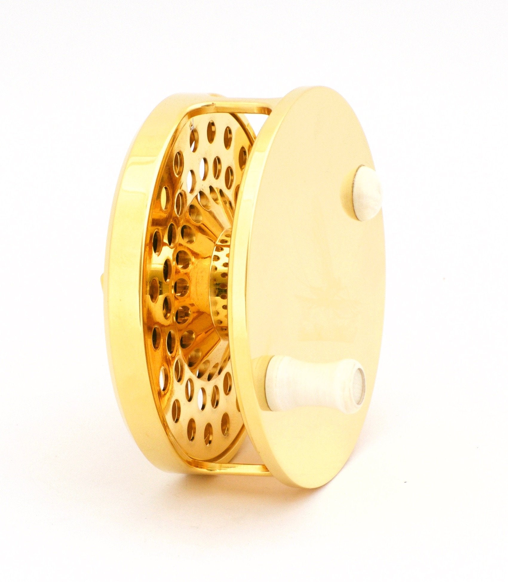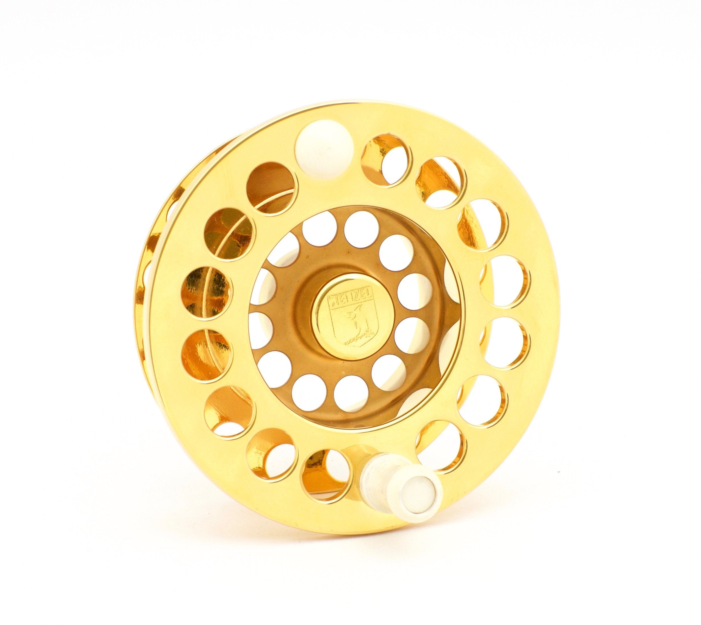 For sale here is a beautiful 24k gold plated and highly polished Stenzel Regent No. 02 fly reel. Made in Germany and very rarely do they show up on the market. Comes with two spools, one with photorealistic engraving and standard arbor and the other with a large arbor ported design. Both have a crank handle and counterbalance made of fossilized mammoth ivory. 2 7/8" diameter. 3/4" spool width. Left hand retrieve. Palmable rim. Adjustable disc drag with soft bi-directional click, which can be set to silent. Strong drag if needed. Like new condition.