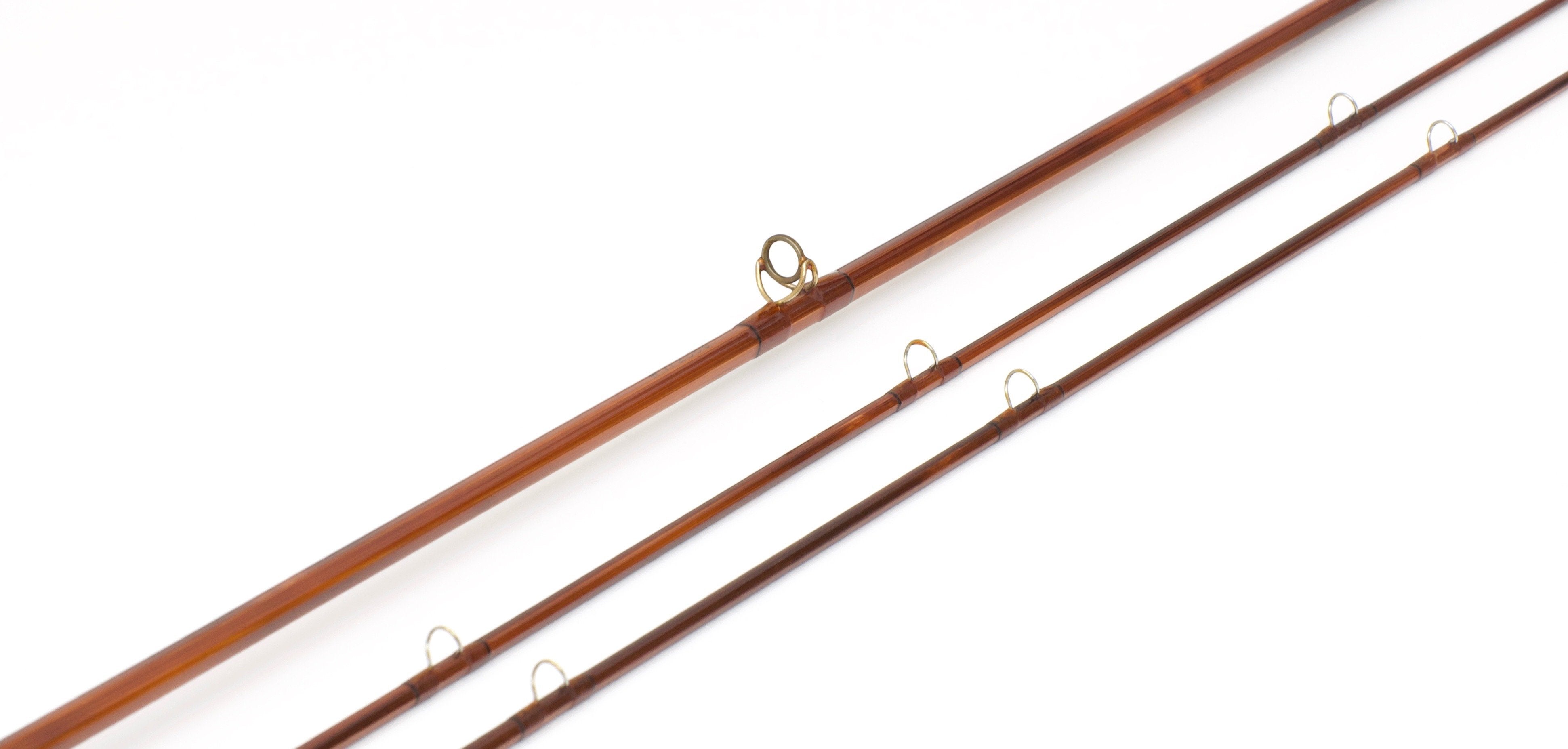 The rod features handsome flamed cane with exquisitely wrapped transparent, caramel brown silks with black tipping. The script remains clean and bold. Garrison-style hook keeper. Full wells grip measures 6 3/8" in length with light soiling. Bright aluminum down-locking reel seat over a mortised walnut spacer. "R.W. Summers Co. Traverse City, M.I. U.S.A." is stamped on the butt cap. The ferrule fit is excellent. The rod weighs 5.30 oz. Medium-fast action and parabolic. Includes original labeled bag with attached ferrule plug and tube with Summers' unique brass fittings.