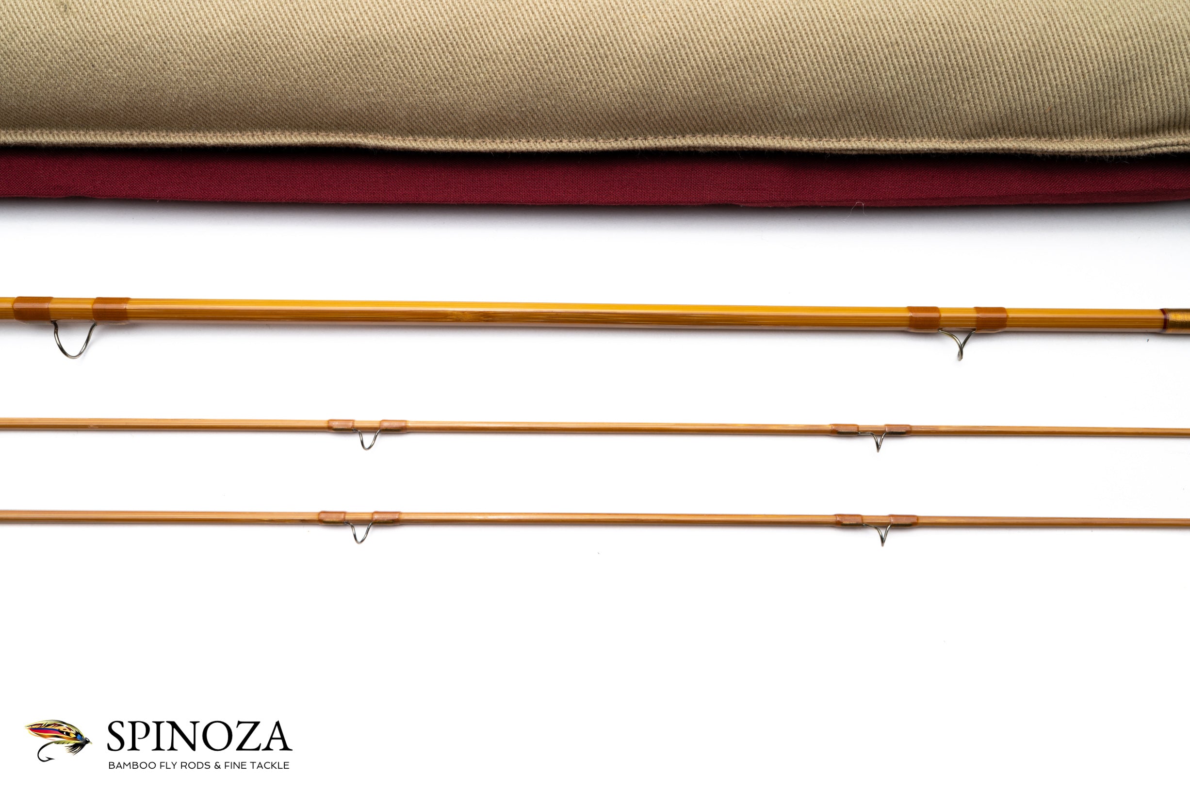A nice Sweetgrass bamboo fly rod, 8', 2-piece, 2-tip, and built for a #4 or #5. Serial #1221. Excellent lightly used condition with a small amount of soiling to the grip, and one tiny varnish chip between the second and third guide from the tip on one of the tip sections (the other doesn't appear to have ever been used). Very clean. Medium-fast, full flexing action. The ferrule fits are good, and the rod is nice and straight. Medium wheatstraw colored cane done in a two opposed node pattern construction. The varnish is nicely done and in great condition. The ferrules have the typical Winston-style overwraps. Light caramel colored wraps with cinnamon tipping at the grip, ferrules, and tip-top (the small signature wrap above the inscription on the rod is black with caramel tipping). Agate stripper. Mildly sculpted full wells grip with an oxidized rear cork check and ring over a mortised and stabilized burl wood spacer that flares at the bottom to keep the ring on (a small oxidized disc is also inset in the bottom of the seat. The rod packs into a burgundy colored cloth bag with "SR" embroidered on the flap and an aluminum tube with the sweetgrass data sticker and brass fittings. There is also a handsome tan twill outer rod tube bag as well.