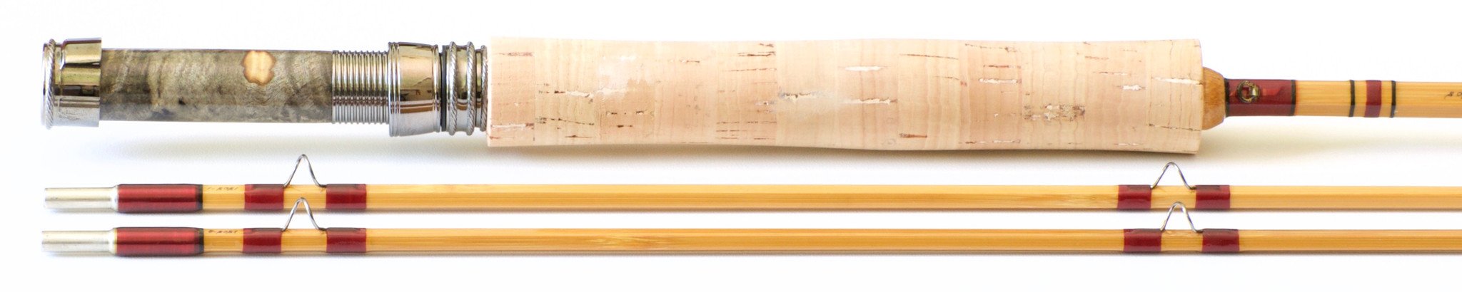 For sale here is a 7'6 for a 5 weight, two-piece, two-tip pentagonal bamboo rod made by the Booboys at Sweetgrass Rods. The rod is in mint condition. Nickel silver hardware, oxidized down-locking reel seat over a fine exotic wood spacer. Beautiful garnet wraps contrasted against the blonde cane really set the rod off. Jet black tipping at the signature wrap, winding check, and tip-tops. Full wells grip that is shallower than most. Bamboo winding check. Agate stripping guide. Ferrule size 11/64 and the fit is excellent. Superb dry-fly action. Sweetgrass five-strip, or "penta" rods, have a reserve power that surprises. The rod weighs 3.85 oz. Rod comes with original maroon bag and tube with Sweetgrass label.