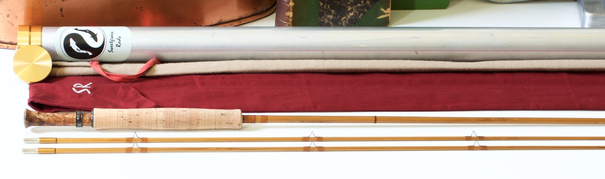 For sale here is a Sweetgrass bamboo rod - 8' 2/2 4-5wt. Excellent++ condition. Oxidized hardware, nickel silver up-locking ring reel seat over gorgeous wood spacer, stunning agate stripping guide, weighs 3 7/8 oz. Size 13/64 ferrules. Nice and powerful full-working medium action. Original bag and tube as well as a protective canvas bag for the tube.