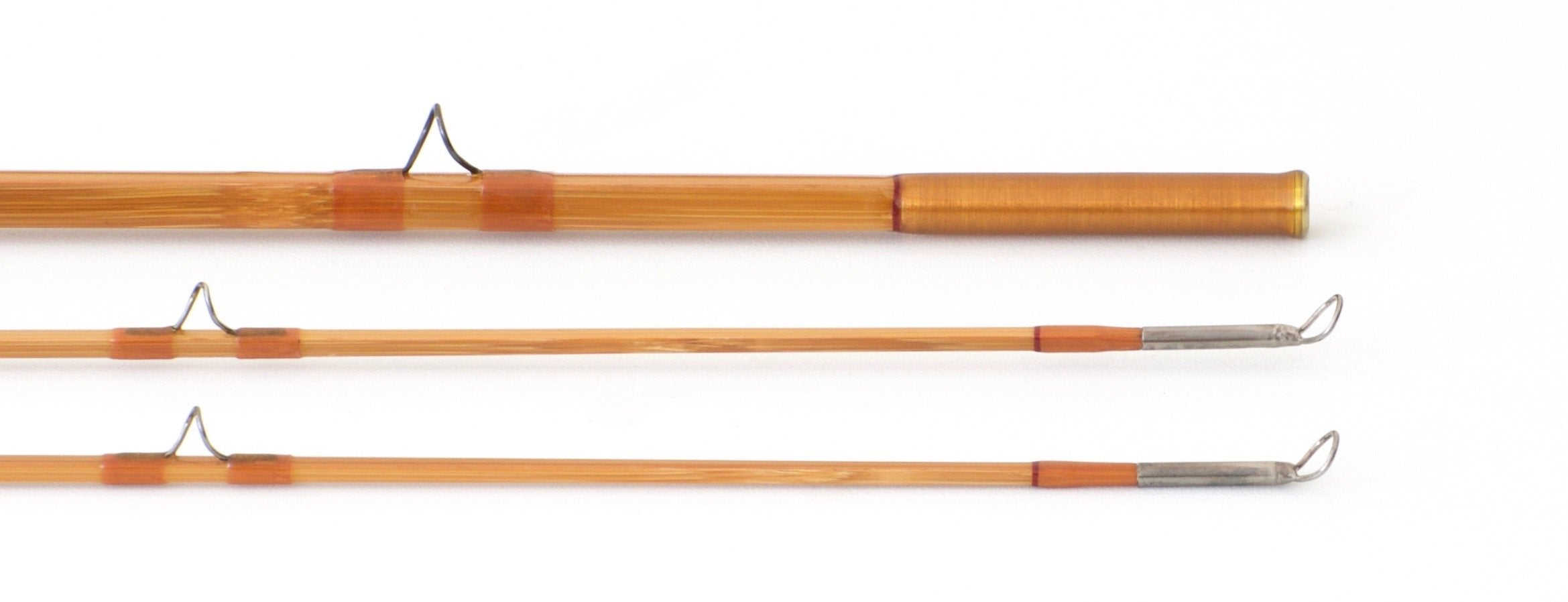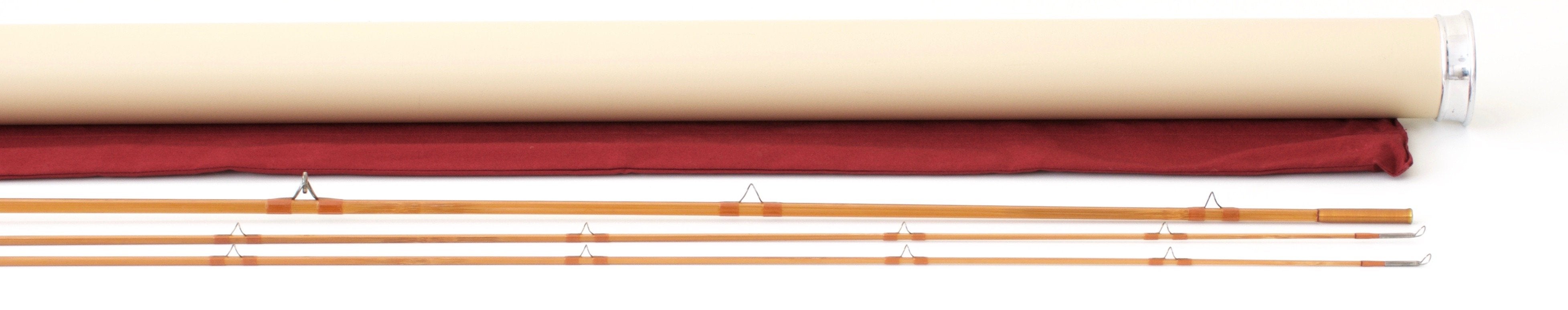 Transparent honey-colored wraps with burgundy and bright amber tipping. The tips are numbered for convenience. Agate stripping guide. Lightly blued guides. Handsome nickel silver hook keeper with a twisted rope pattern. Bamboo winding check. The full wells grip is 6" in length with light soiling. Bright nickel silver down-locking reel seat over a beautifully figured bird's eye maple spacer. The Sweetgrass Rods logo is stamped into the bottom if the butt cap. The ferrules fit nice and tight as they should. The rod weighs 4.85 oz. The rod has a medium-fast dry-fly action that balances very nicely in the hand. Includes original bag and white powder coated tube with label.