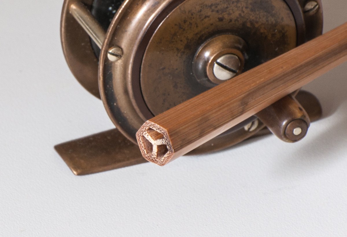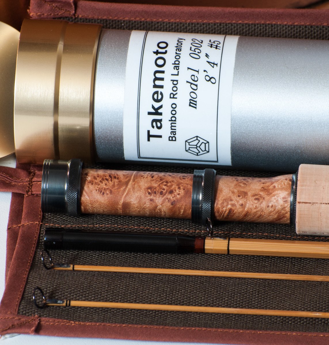 For sale here is another amazing rod by Maseke Takemoto (Hollow T Construction). Model #0502 -- 8'4 3/2 for a 5wt. Glass ferrules. Exceptional cane work! Tung oil finish. Patent-pending single wire/single foot snake guides. Blued nickel silver cap and ring. Blonde cane. Clear wraps tipped black. On the fast side of medium fast action. The rod weighs a mere 3 1/2 oz and is an absolute joy to cast. Don't miss out on this one!