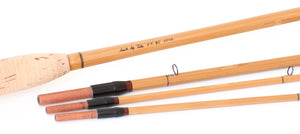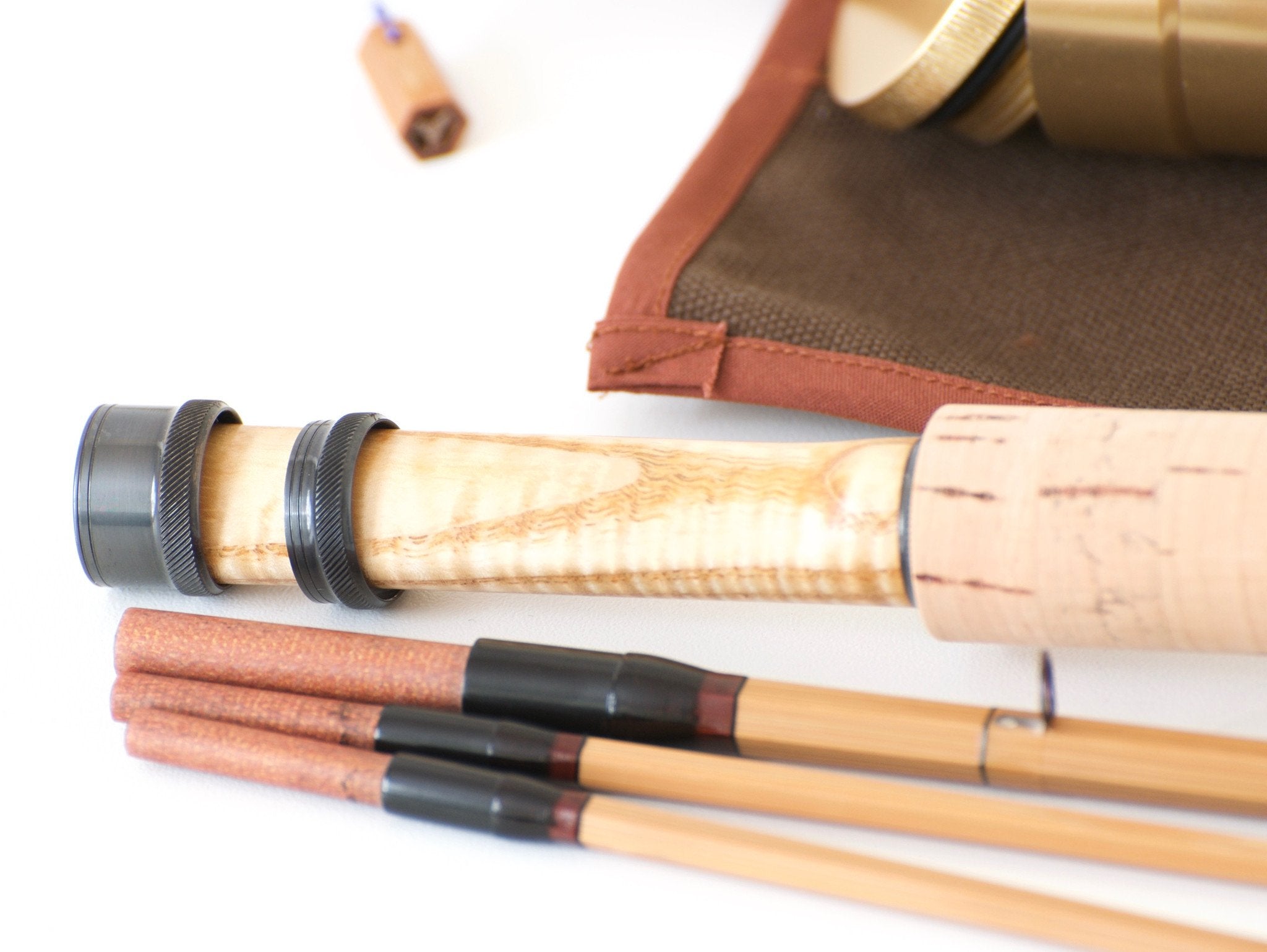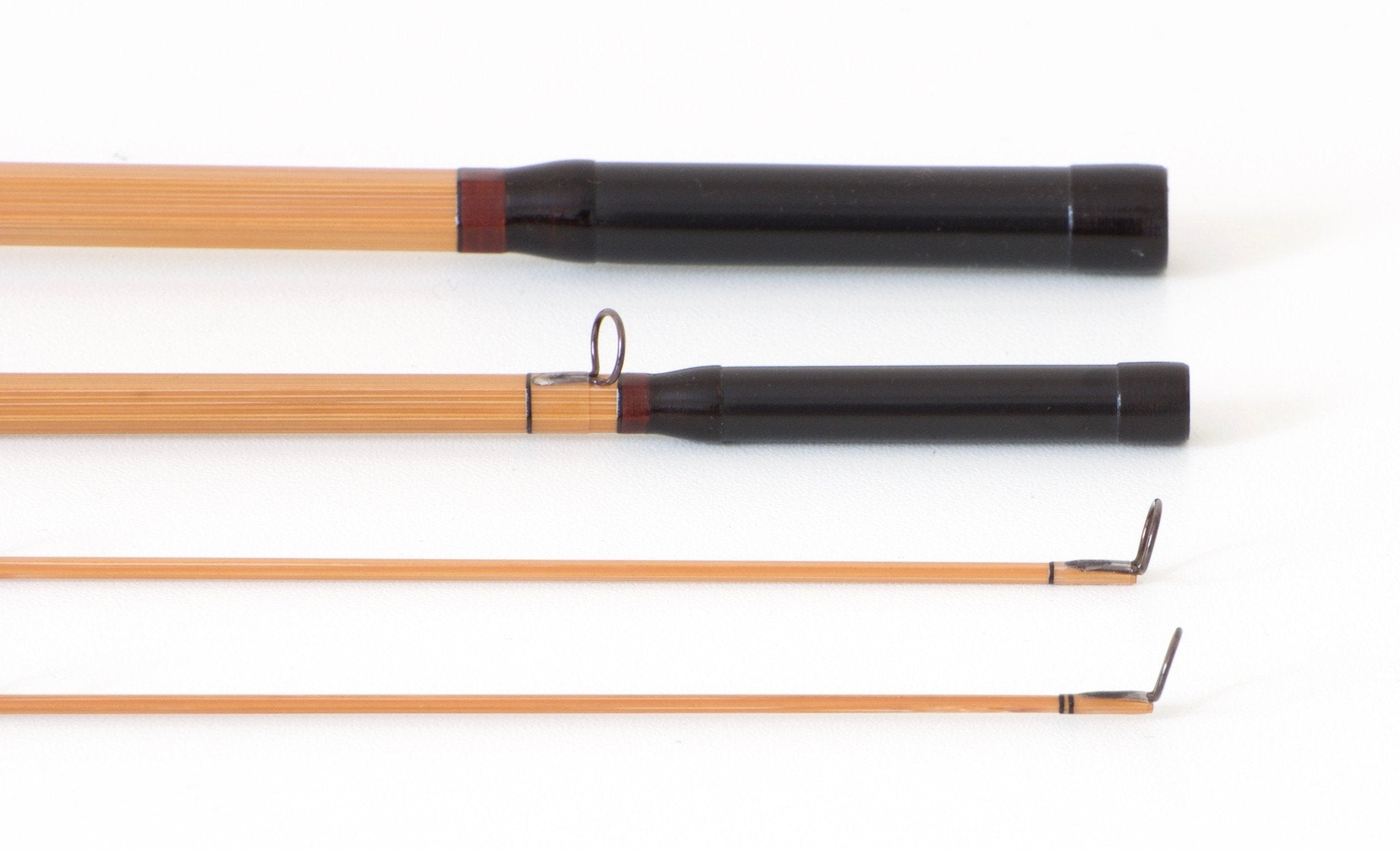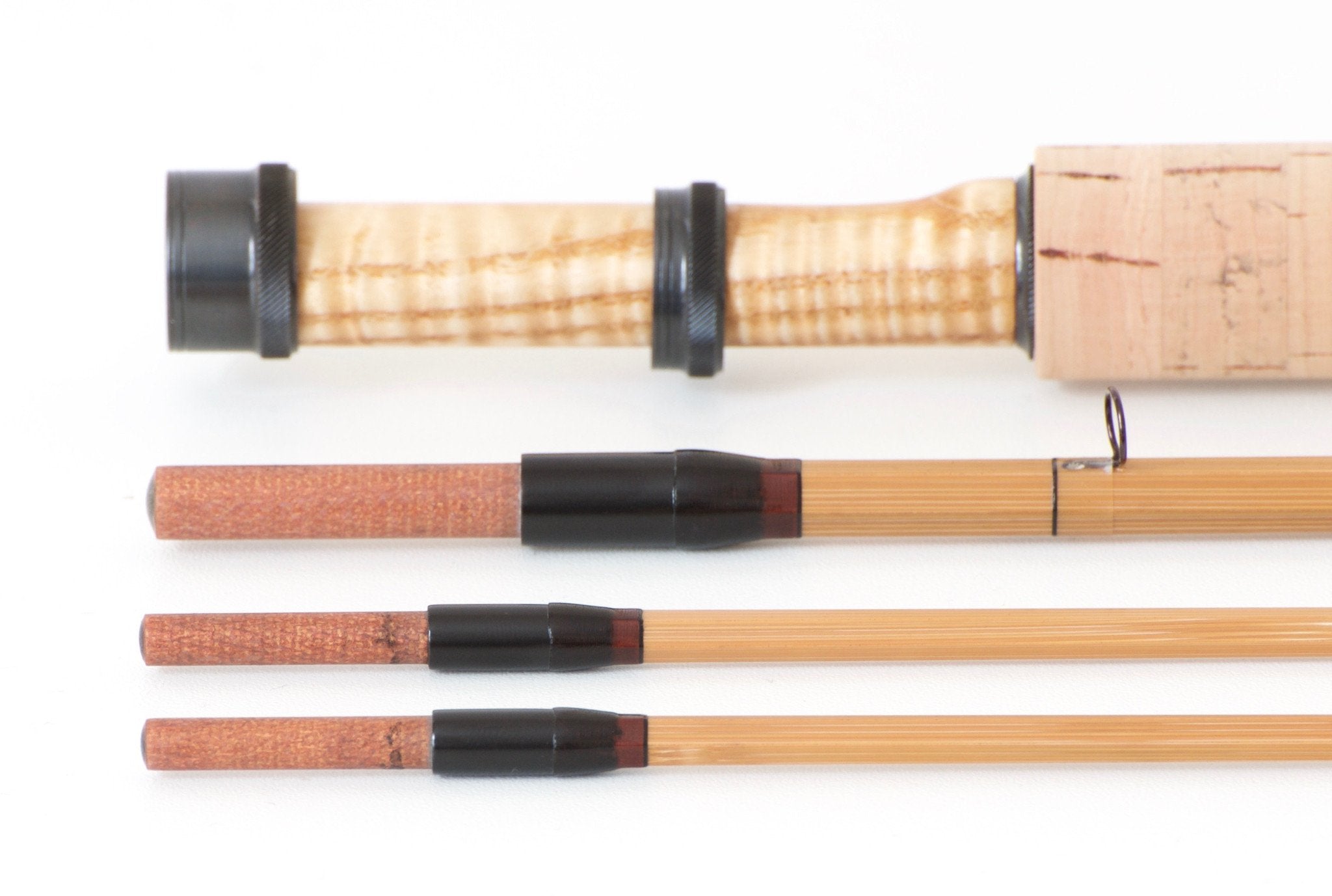 For sale here is another amazing rod by Maseke Takemoto (Hollow T Construction). Model #0502 -- 8'4 for a 5wt line. The rod remains in mint condition having only been assembled and lawn cast (the marks on the male ferrules in the photos easily came off with a fingernail). Three piece with two tips. Glass ferrules. Exceptional cane work. Exquisite oil finish. Patent-pending single wire/single foot snake guides. Blued nickel silver cap and ring. Clear wraps tipped black. On the fast side of medium fast action. This rod has amazing reserve power in the butt section when called upon. An absolute pleasure to cast and weighs in at only 3 5/8 oz.