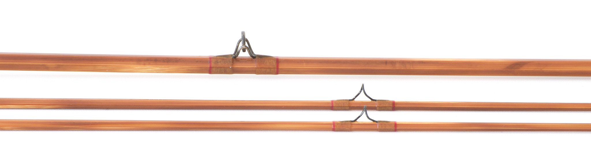 For sale here is a bamboo rod made by RD (Bob) Taylor - 7' 2/2 for a 4 weight line (Model 24). Serial no. 288. The rod is in excellent used condition. All sections are full length and straight. Medium flamed cane. Deep golden wraps with red tipping. Red, gold, and plum tipping at the winding check and male ferrules. Blued hardware throughout. Ring hook keeper. Swelled butt. Cigar grip is soiled but in excellent shape. Nickel silver checks on either side of the grip. Handsomely blued cap and ring over a very nice walnut insert. There are a few minor marks on the insert from a reel foot. The bluing also shows some wear around the edges. Stamped on the buttcap is, "RD TAYLOR MAKERS". The ferrule fit is perfect. The rod weighs 3 3/8 oz. The action is medium-fast and has a nice action for dry fly fishing. Includes original bag and tube with brass fittings as well as a canvas cover for the tube.