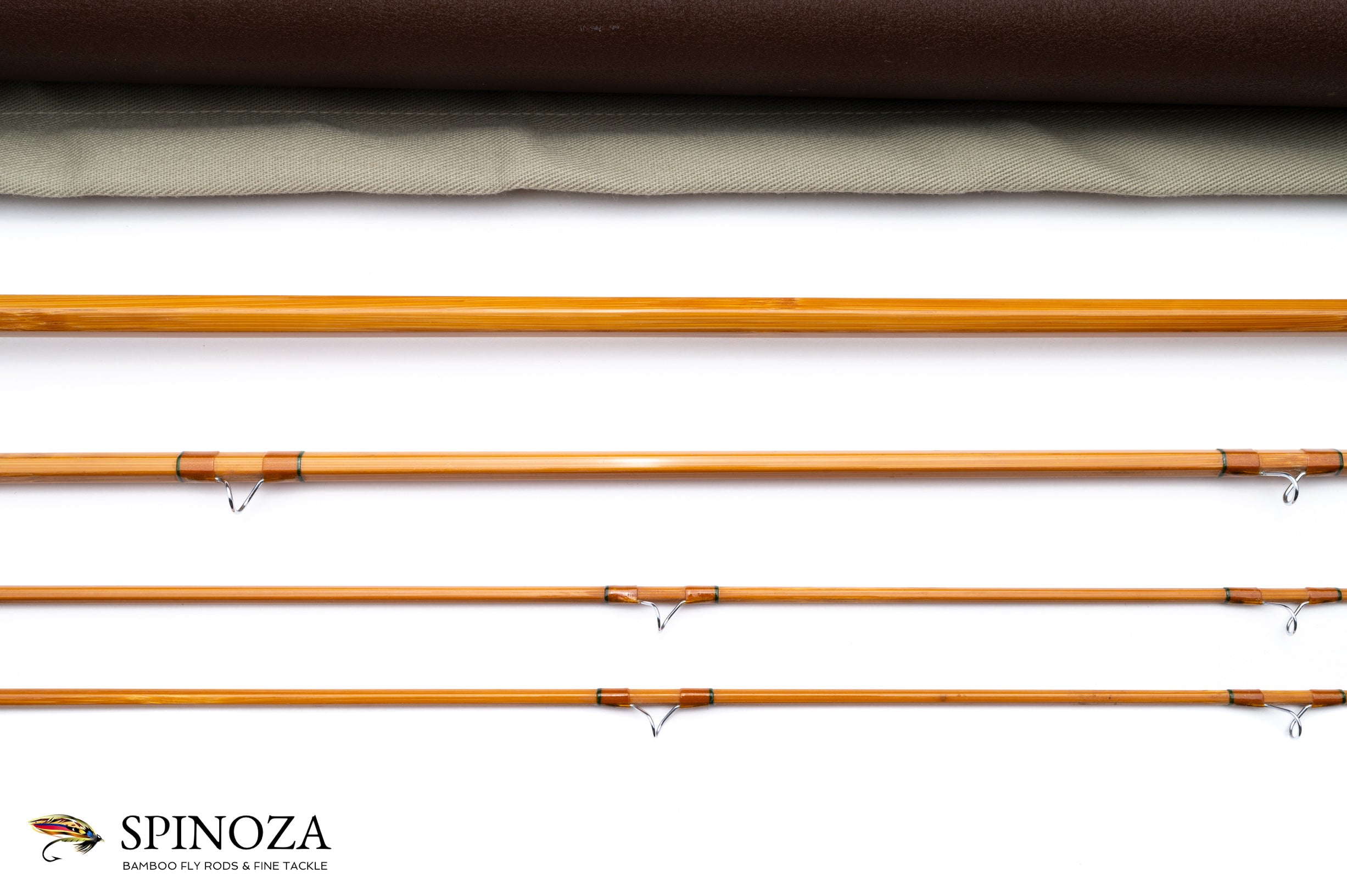 A Ted Simroe bamboo fly rod, 8', 3-piece, 2-tip, and built for a #6 or #7. Serial #682. Medium action. The rod weighs 5.2 ounces on my scale. Fair used condition and the rod has been reconditioned, with the ferrules appearing to have been re-wrapped and the grip sanded. The rod could use a varnish touch up adjacent to the ferrules and a bit of a straighten. Wheatstraw color cane done in a three up node pattern (there are some tiny spot seams adjacent to the nodes on the butt). The rod is varnished with light gold main wraps with green edges. Chrome snakes and tip tops. Polished swiss ferrules. The 6" grip is shaped to a blunt western profile with a hidden pocket cap. The seat is a polished uplocking screwlock with a wood spacer. The rod packs into a light olive bag and a brown crackle paint tube with brass fittings.