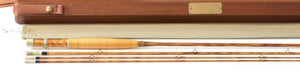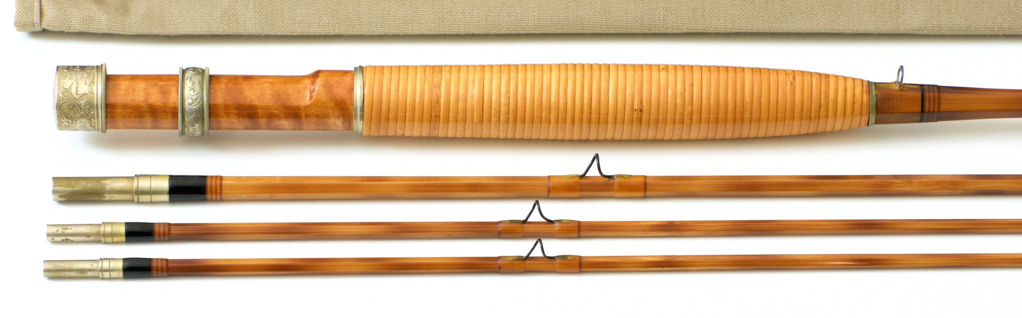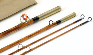 For sale here is a Thomas and Thomas (T&T) 20th Anniversary Limited Edition Bamboo Rod - 8' 3/2 5wt. There were only 25 of these made in 1989 to commemorate T&T's 20 years of rodmaking. Nicely mottled flaming on the cane (some call it tiger striping) and beautiful rattan grip. Gorgeous swelled butt. Fine engraving on the reel seat cap and ring. The rod comes with the original hexagonal wooden tube and sock. Excellent plus condition.